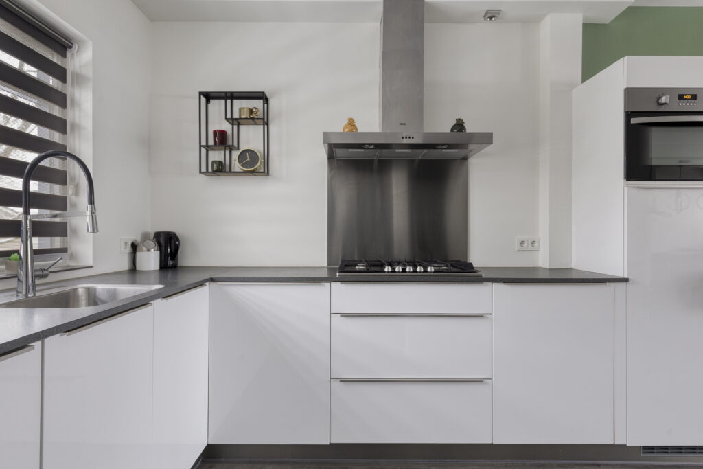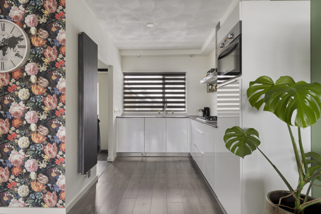 De hal met meterkast, garderoberuimte en trapopgang, biedt toegang tot de wasruimte met cv-ketel (2024) en aansluitingen voor de wasapparatuur. Toegang tot de keuken welke is ingericht met een modern en compleet ingericht keukenblok in hoekopstelling met vaatwasser (2024), vijfpits gaskookplaat, afzuigkap, koelkast en combimagnetron. Een groot raam biedt hier uitzicht op de galerij en de voor het complex gelegen groenstrook.