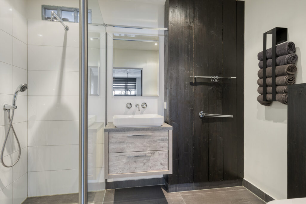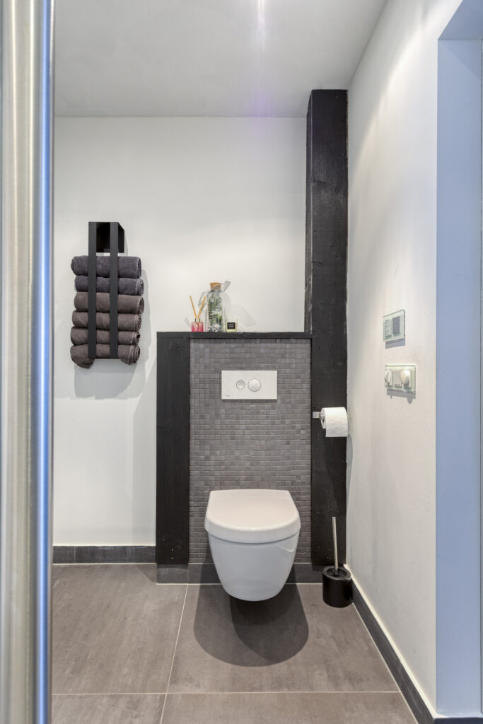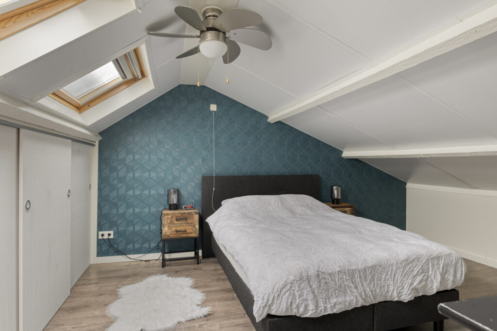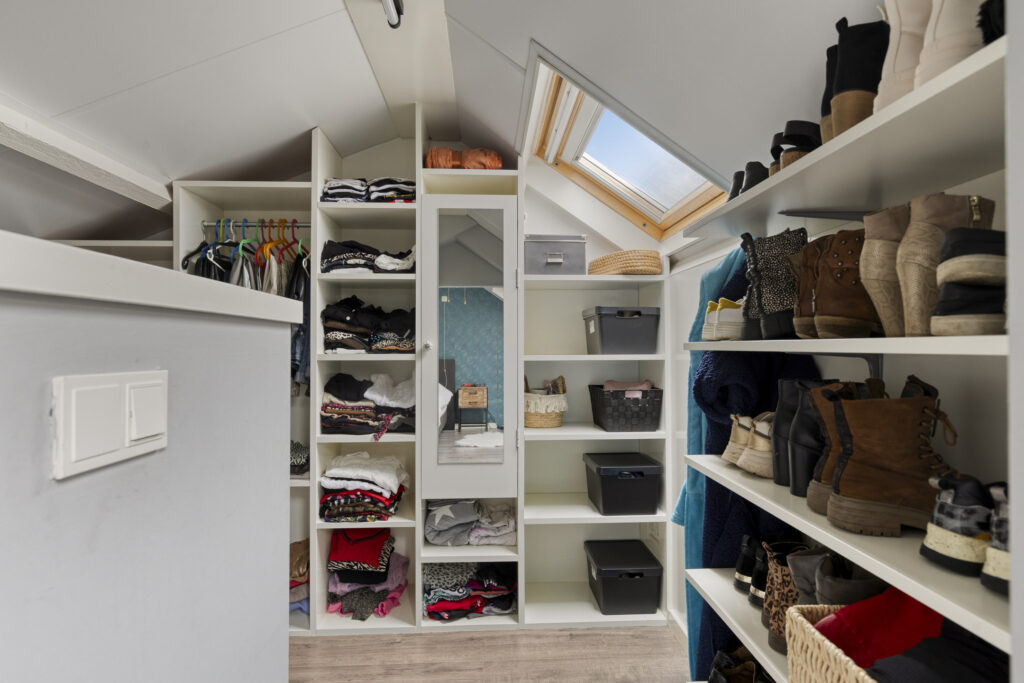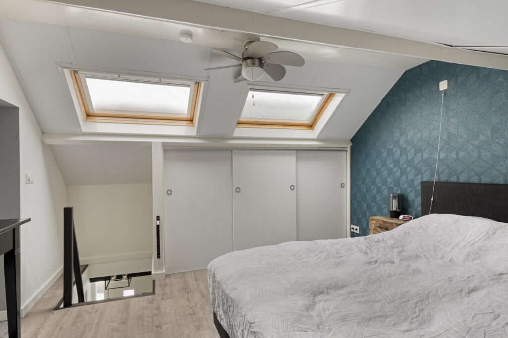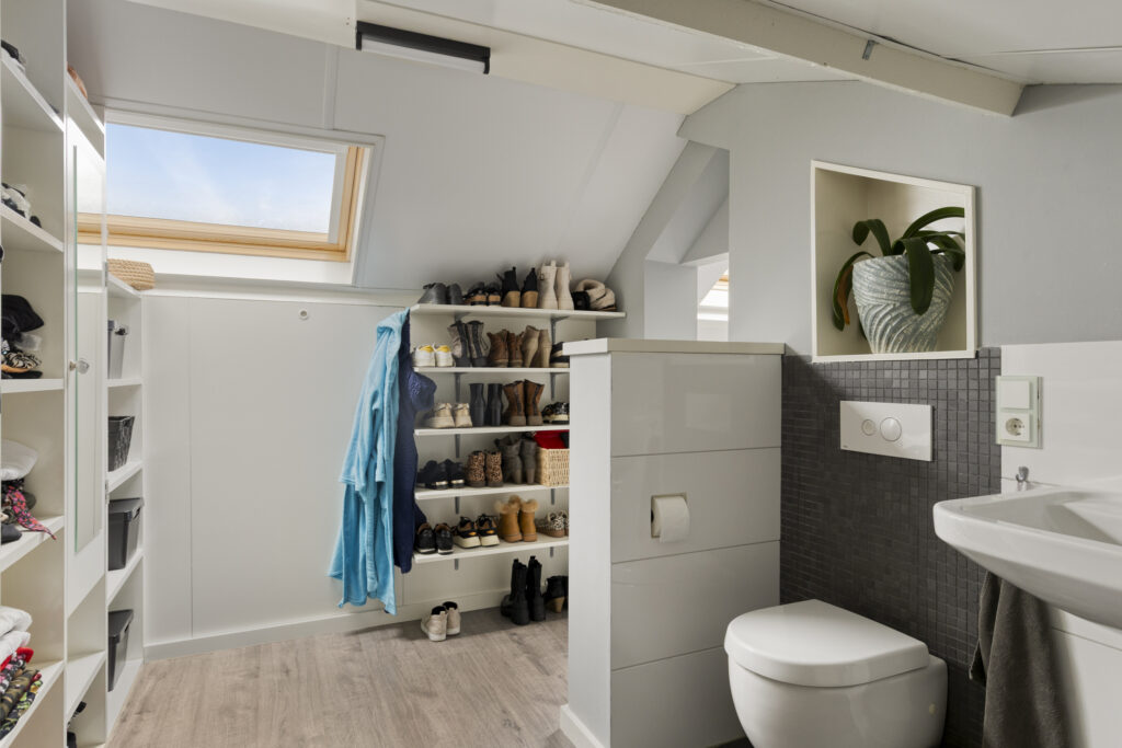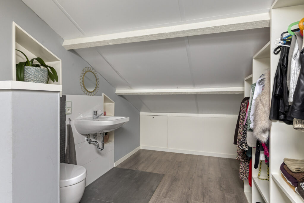 Via de trap bereik je vanuit de hal de tweede woonlaag. Hier bevindt zich een royale slaapkamer, uitgerust met twee grote dakvensters. Aan beide zijden voorzien van extra opbergruimte. Via een open doorgang is een riante kastenkamer bereikbaar met diverse kasten, planken en extra opbergruimte. Tevens is hier een toiletruimte gerealiseerd met een hangend toilet en een wastafel.