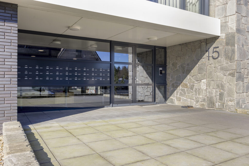 Buiten voor de toegangsdeur bevindt zich een bellentableau met camera. Bij binnenkomst, via de centrale entree met dubbele automatische deuren, betreedt u een ruime en stijlvolle ontvangsthal met brievenbussen en toegang tot de lift. Hier bevindt zich tevens het trappenhuis vanwaar u toegang heeft tot alle verdiepingen waaronder ook de parkeerkelder.