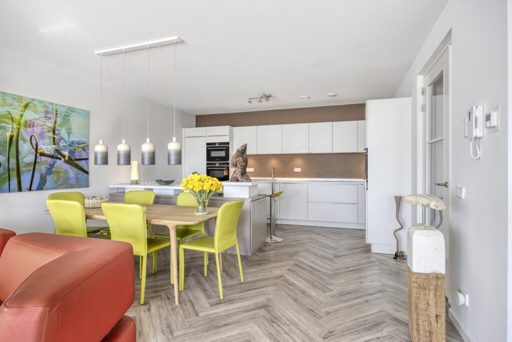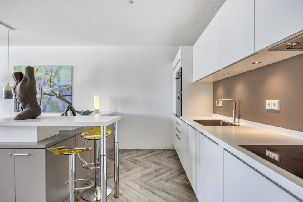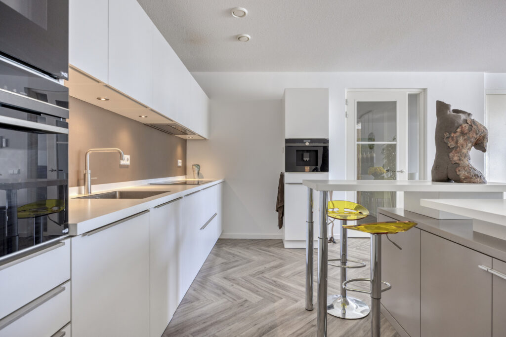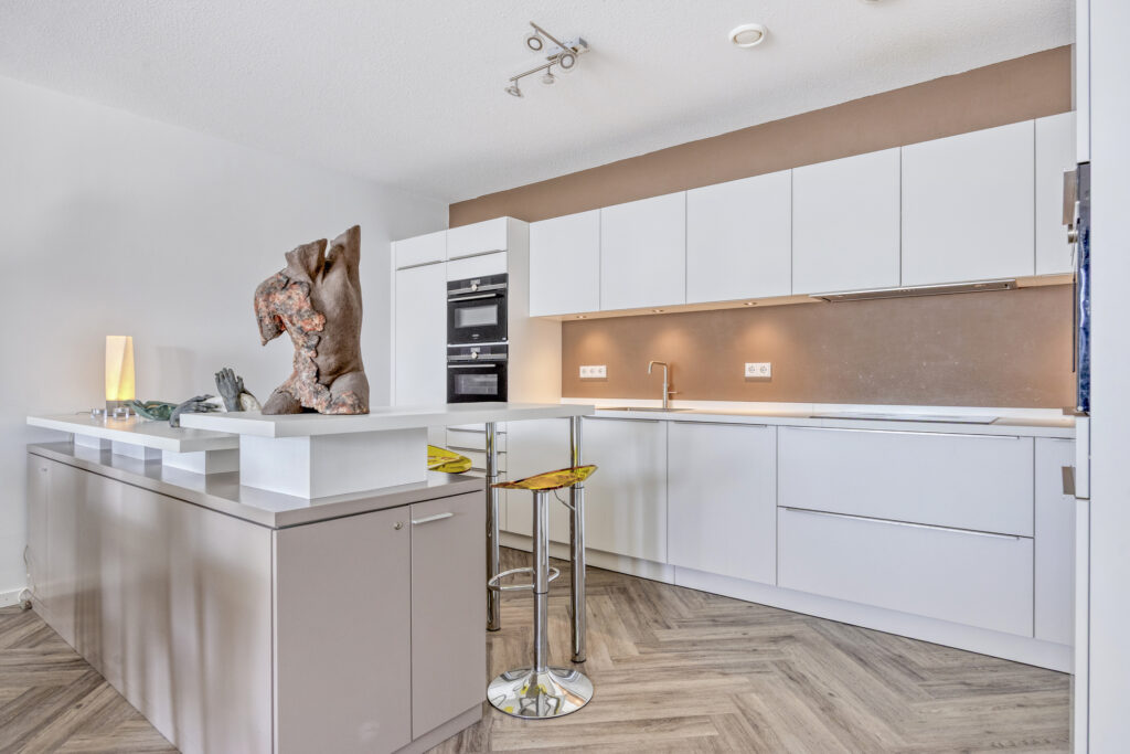 Via een met glas ingezette binnendeur kom je in de sfeervolle woonkamer. Het zitgedeelte is gelegen aan de straatzijde en heeft een groot raam met een elektrisch screen. Een deur biedt directe toegang tot het overdekte balkon op het zuidwesten. De moderne open keuken is uitgevoerd in een stijlvolle en complete opstelling. De keuken beschikt over diverse hoogwaardige inbouwapparatuur zoals een inductie kookplaat met afzuigkap, combi oven/magnetron, combi stoomoven/oven, vaatwasser, een koel-/vriescombinatie, een koffieautomaat en een spoelbak met een Quooker. Een bijpassend keukeneiland biedt naast kastruimte ook een zitgedeelte, waardoor er een gezellige eetgelegenheid ontstaat.