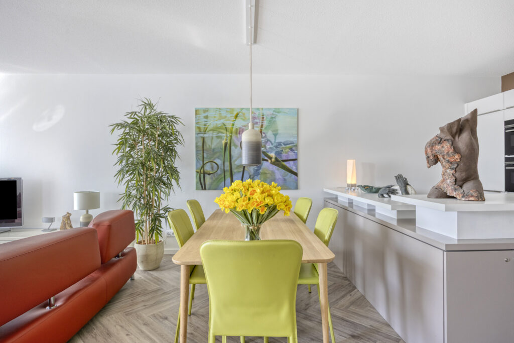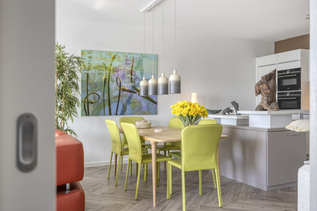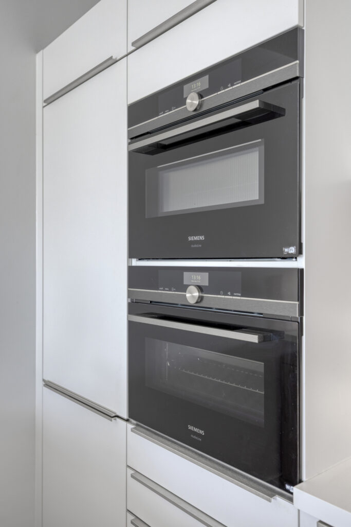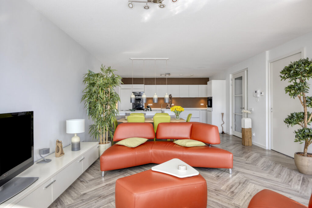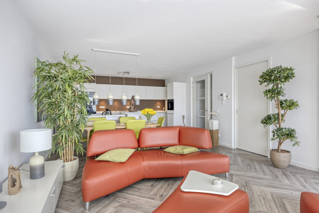 Via een met glas ingezette binnendeur kom je in de sfeervolle woonkamer. Het zitgedeelte is gelegen aan de straatzijde en heeft een groot raam met een elektrisch screen. Een deur biedt directe toegang tot het overdekte balkon op het zuidwesten. De moderne open keuken is uitgevoerd in een stijlvolle en complete opstelling. De keuken beschikt over diverse hoogwaardige inbouwapparatuur zoals een inductie kookplaat met afzuigkap, combi oven/magnetron, combi stoomoven/oven, vaatwasser, een koel-/vriescombinatie, een koffieautomaat en een spoelbak met een Quooker. Een bijpassend keukeneiland biedt naast kastruimte ook een zitgedeelte, waardoor er een gezellige eetgelegenheid ontstaat.