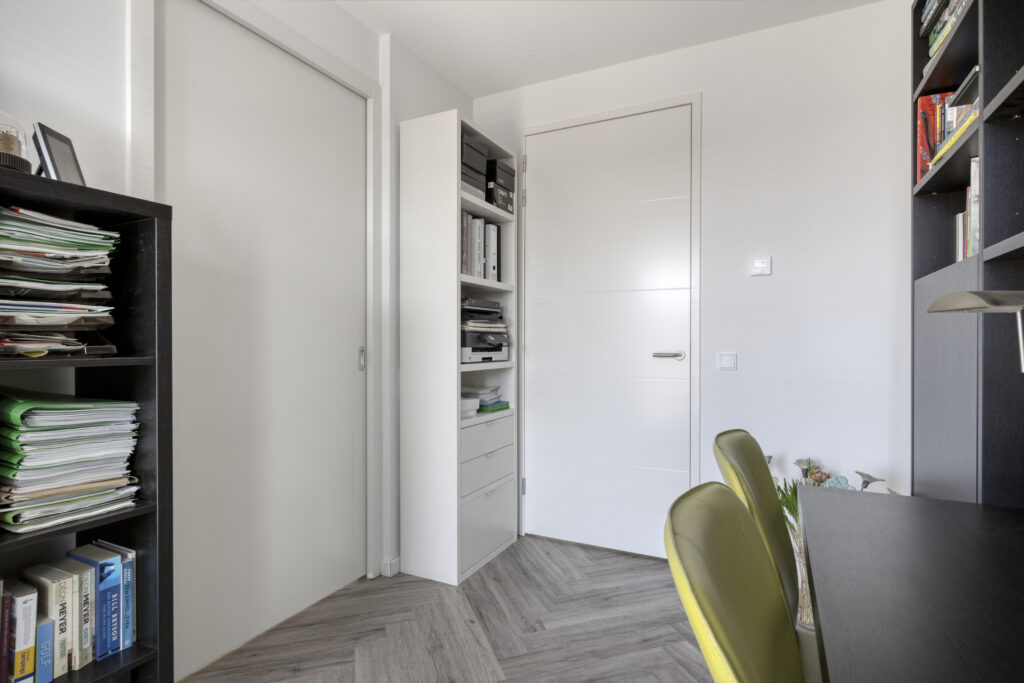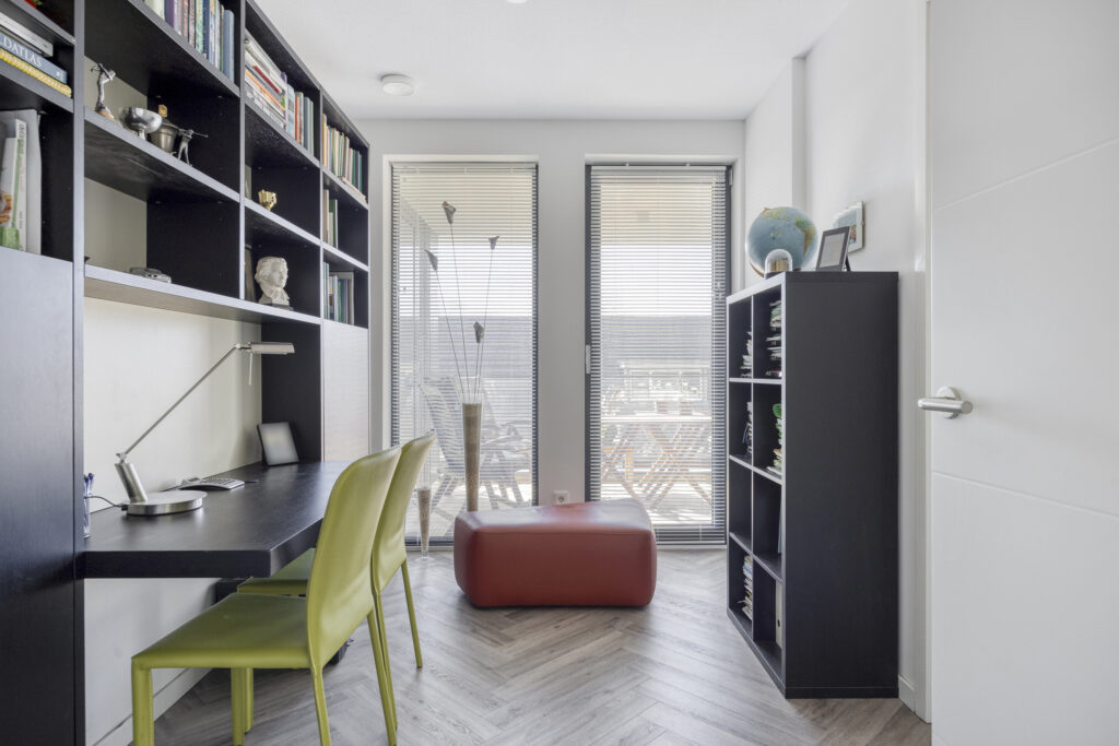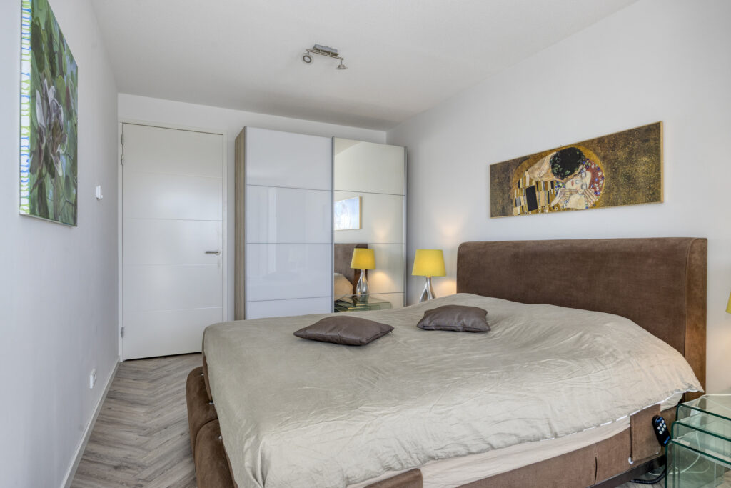 Vanuit de woonkamer is via een schuifdeur een werk-/slaapkamer bereikbaar welke desgewenst bij de woonkamer is te betrekken. Ook hier toegang tot het balkon. Vanuit de hal is de royale slaapkamer te bereiken. Deze slaapkamer heeft hoge raampartijen en is voorzien van een elektrisch sunscreen en biedt toegang tot het overdekte balkon. De moderne badkamer is compleet ingericht met een inloopdouche, een wandcloset en een dubbele wastafel met ladeblok, spiegel en bijpassende kasten. Er is mechanische ventilatie aanwezig.