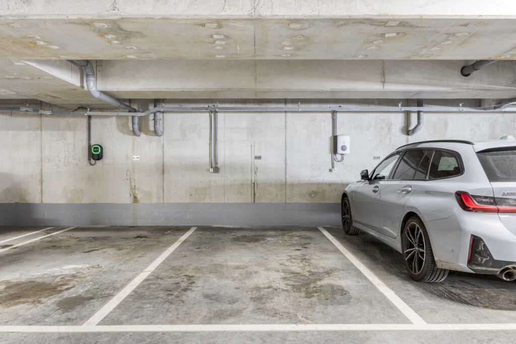 In de afgesloten parkeerkelder beschikt het appartement over een ruime privé-parkeerplaats en een eigen (fietsen)berging. De parkeerplaats is voorbereid voor het kunnen laden van een elektrische auto. De parkeerkelder is toegankelijk via een elektrisch bedienbare toegangspoort en bereikbaar met de trap of lift.
