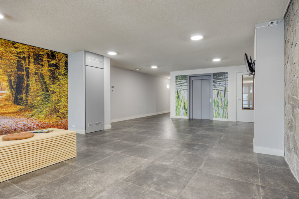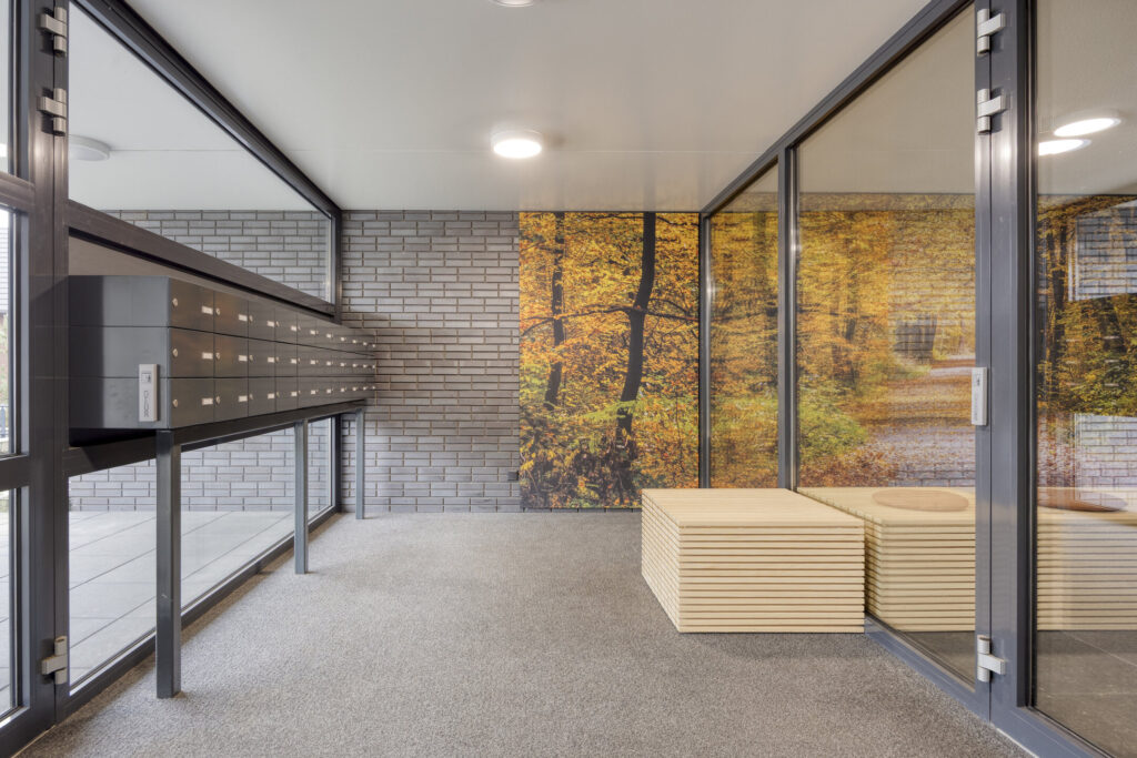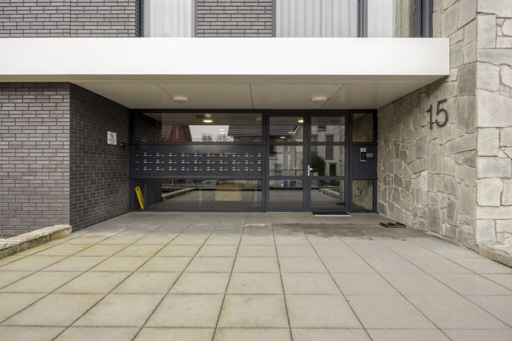 Buiten voor de toegangsdeur bevindt zich een bellentableau met camera. Bij binnenkomst, via de centrale entree met dubbele automatische deuren, betreedt u een ruime en stijlvolle ontvangsthal met brievenbussen en toegang tot de lift. Hier bevindt zich tevens het trappenhuis vanwaar u toegang heeft tot alle verdiepingen waaronder ook de parkeerkelder.