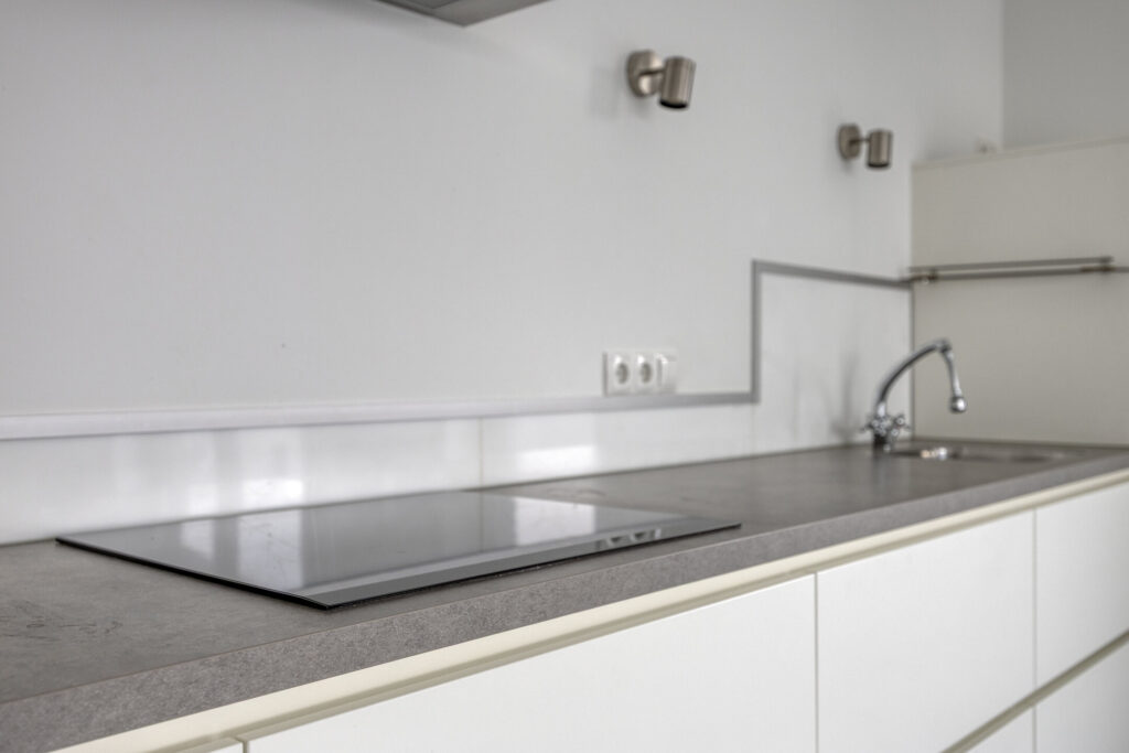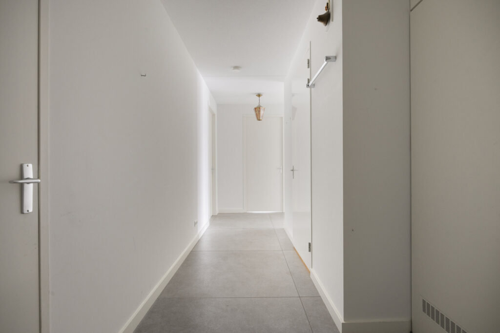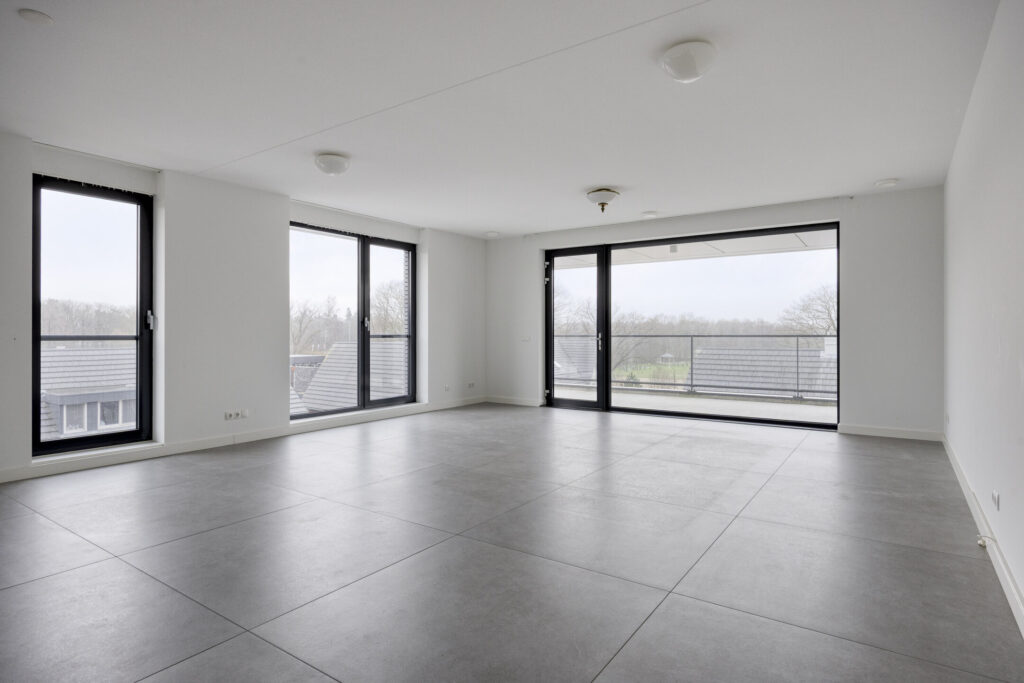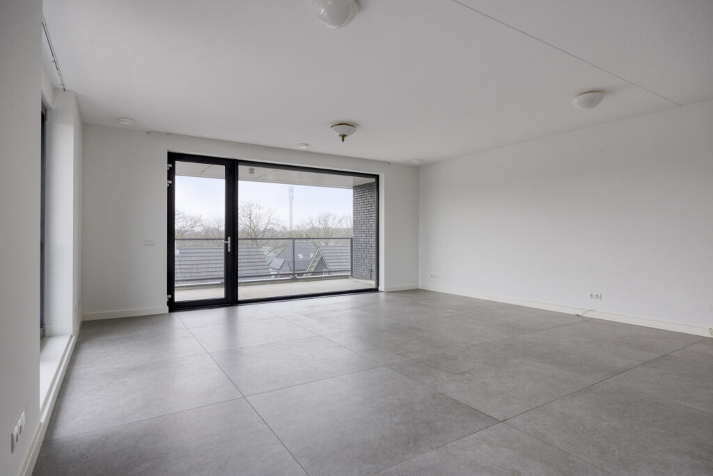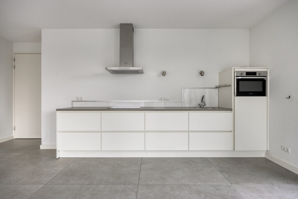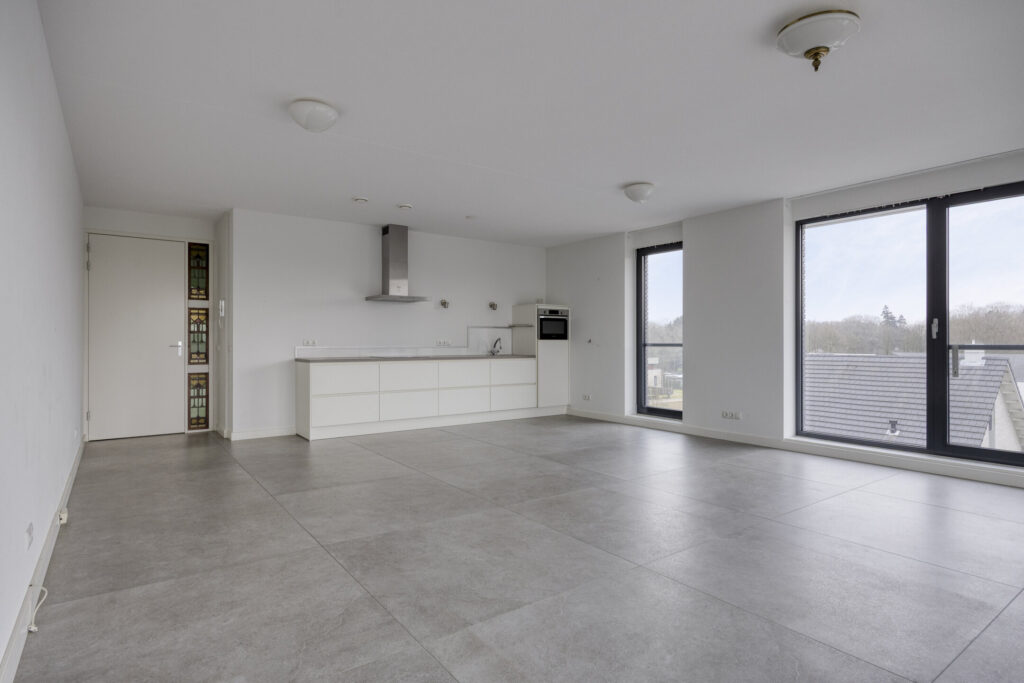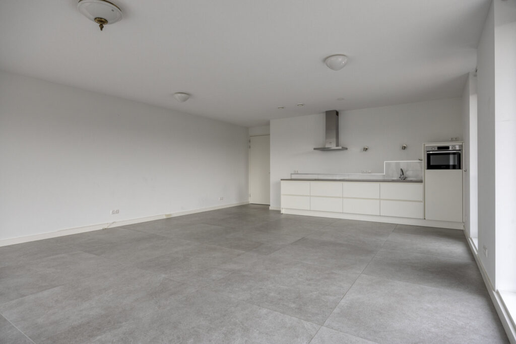 De entree/hal biedt toegang tot alle vertrekken en is afgewerkt met een grijze tegelvloer met grote 120 x 120 tegels. De gehele vloer van het appartement bestaat uit deze tegels en is voorzien van vloerverwarming. Vanuit de hal heeft u toegang tot de ruime woonkamer. De lichte woonkamer is voorzien van grote raampartijen in aluminium kozijnen met dubbele beglazing, wat zorgt voor een heerlijk licht en ruimtelijk gevoel. Aan de woonkamer grenst een royaal balkon (ca. 17 m2), dat gelegen is op het zuidwesten en waar je gedurende de dag volop kunt genieten van de zon en het uitzicht. De open keuken in rechte opstelling is voorzien van een inductiekookplaat met afzuigkap, combimagnetron, koelkast en acht grote lades.