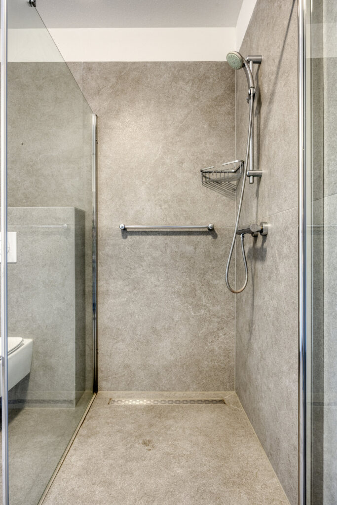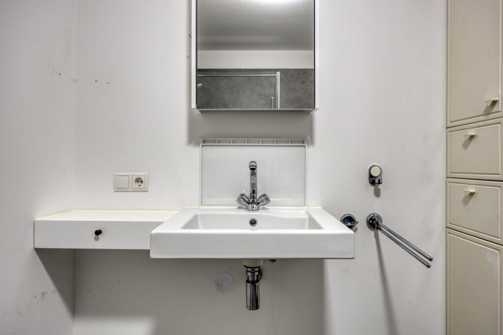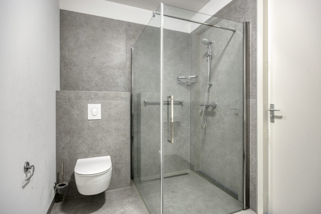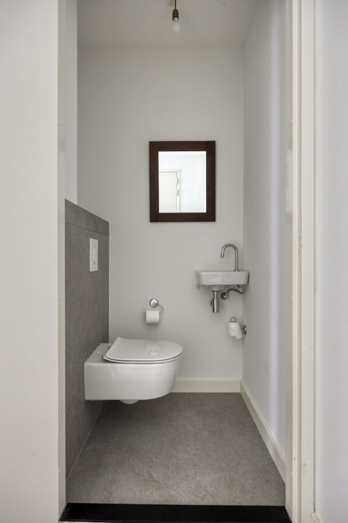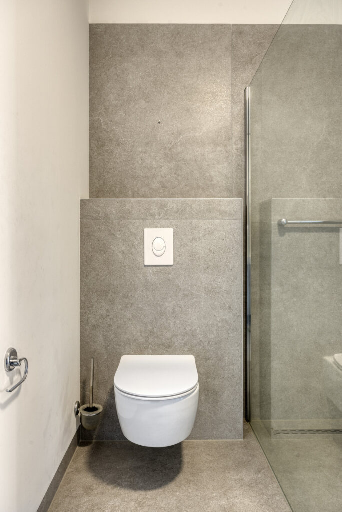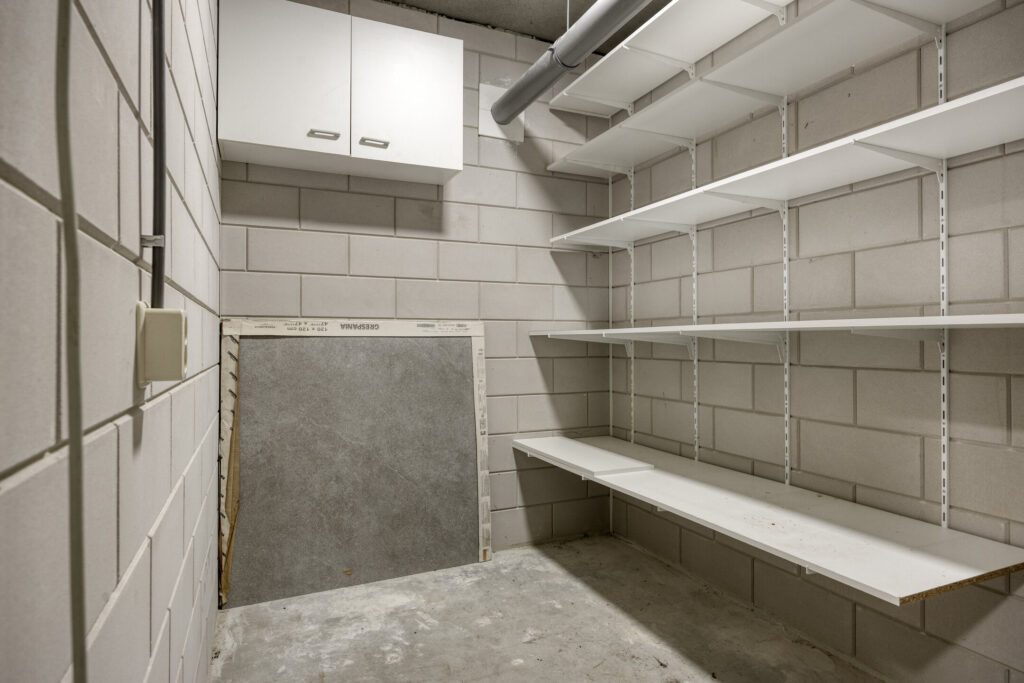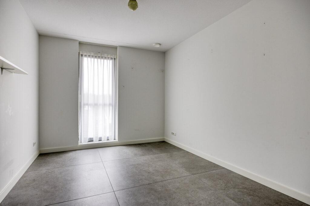 De twee ruime slaapkamers zijn voorzien van aluminium raampartijen met draai-/kiepvensters en horren. Vanuit één van de kamers heeft u een directe toegang tot de badkamer. Deze is volledig betegeld en ingericht met een inloopdouche, wandcloset en een wastafel met wastafelmeubel. Een hoge kast biedt extra opbergruimte. De badkamer is verder voorzien van mechanische afzuiging en vloerverwarming. Een inpandige berging biedt volop extra opbergruimte. De technische ruimte biedt plaats aan de de warmtepomp, WTW-installatie, omvormer van de zonnepanelen en aansluitingen voor de wasapparatuur. Verder in de hal een moderne toiletruimte met hangend toilet en fonteintje.