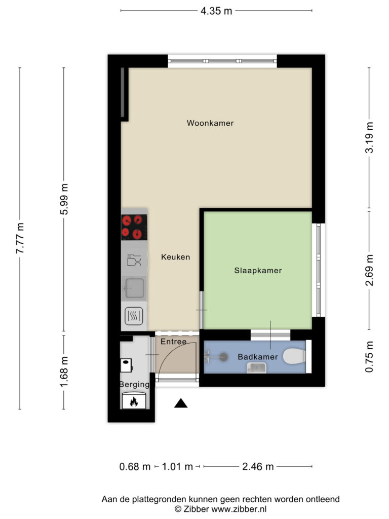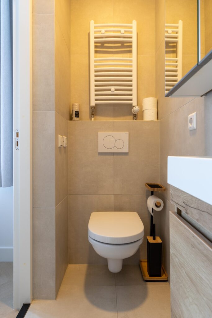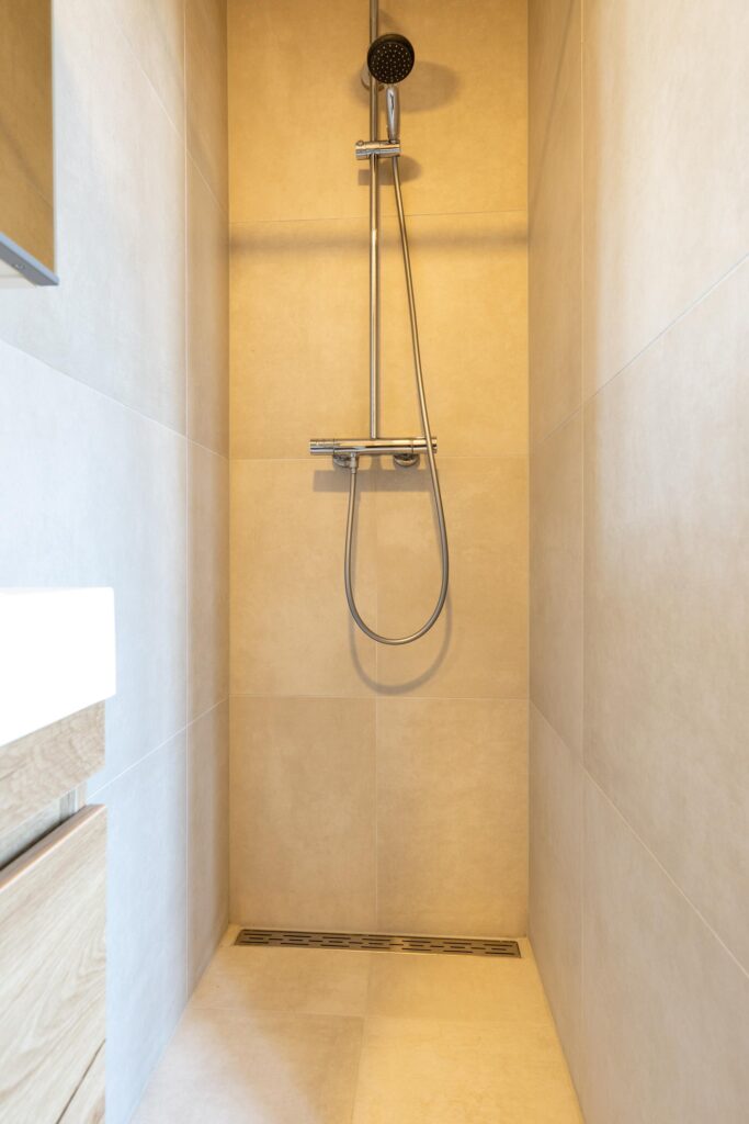 Vanuit de keuken heb je toegang tot de slaapkamer met een grote raampartij. Vanuit hier is er een directe toegang tot de geheel betegelde badkamer uitgevoerd met een inloopdouche voorzien van regendouche (Grohe), wastafelmeubel in licht eiken motief, zwevend toilet (Villeroy & Boch) en een handdoekradiator.