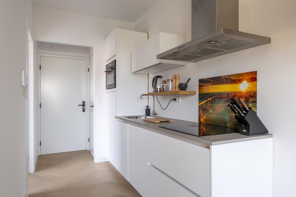 Via de voordeur kom je binnen in een hal die toegang biedt tot de technische ruimte (tevens berging met wasmachineaansluiting) en de keuken. De keuken is modern en greeploos, voorzien van een mooi lichtgrijs composiet werkblad en uitgerust met vijf inbouwapparaten te weten een combi-oven, koelkast, vaatwasser, inductiekookplaat en afzuigkap. Kortom, alles wat je nodig hebt. De lichte woon-/ eetkamer beschikt over hoge en brede raamkozijnen met kamerhoge draai-/kiepvensters met Frans balkon.