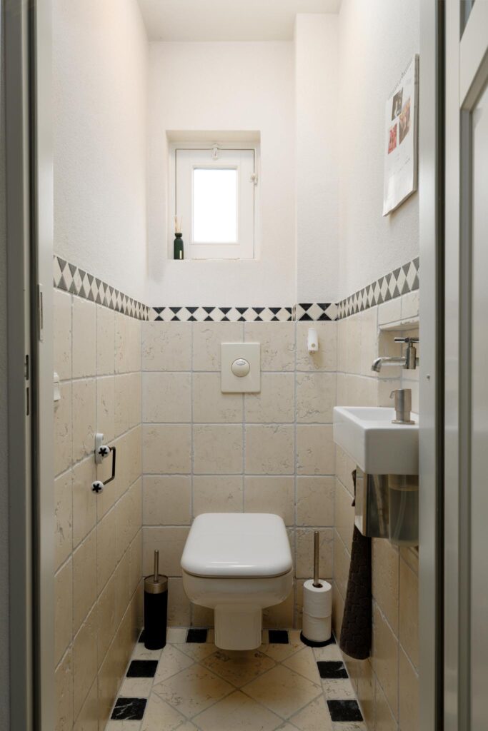 Bij binnenkomst kom je in de hal met meterkast, garderobe en trapopgang en heb je toegang tot een moderne toiletruimte met wandcloset, vloerverwarming en fonteintje. Vanuit de hal stap je door een paneeldeur met glas de woonkamer in.