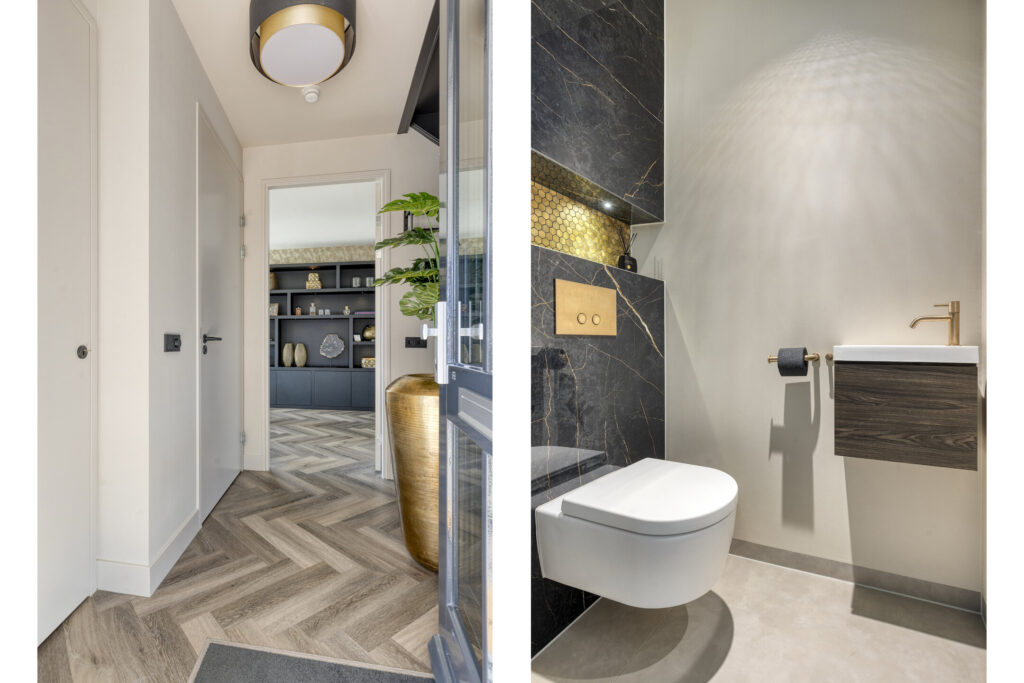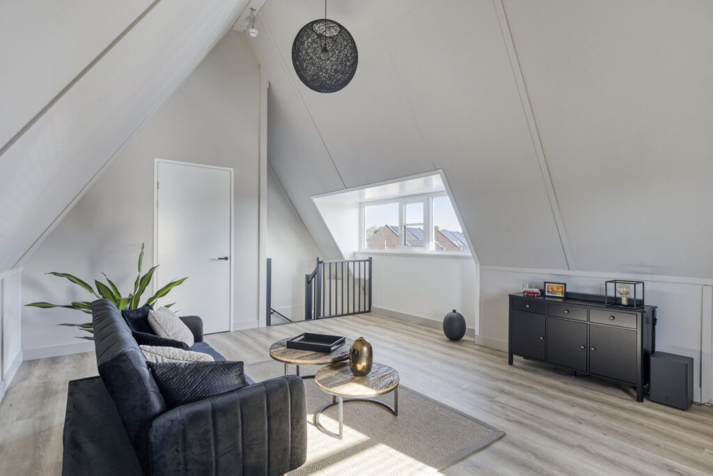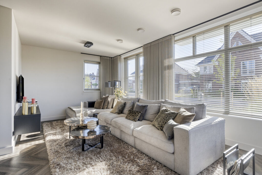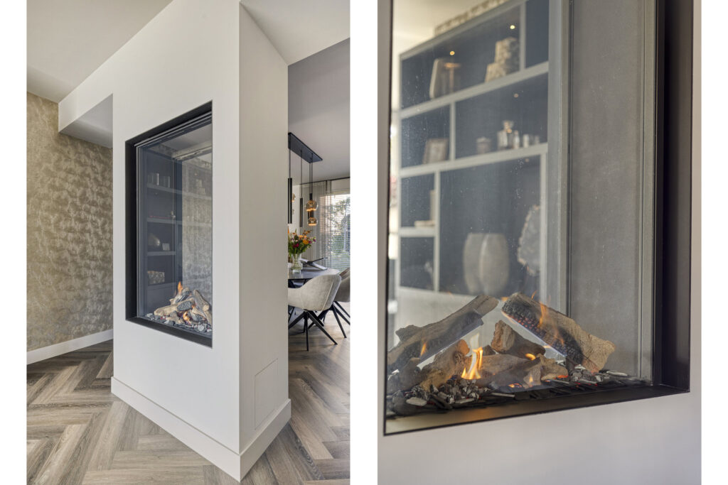 De entree zet meteen de toon: een lichte hal met een moderne trapopgang in zwart, een uitgebreide meterkast en een luxe toiletruimte met wandcloset en fonteintje. Hier ervaart u al de aandacht voor detail en de hoogwaardige afwerking die overal in de woning terugkomt. De woonkamer aan de voorzijde is een heerlijke leefruimte met raampartijen over de hele breedte waardoor een zee aan licht binnenvalt. De strakke wandafwerking in neutrale tinten zorgt voor een rustige basis en de sfeervolle “Dru” doorkijk gashaard maakt het geheel compleet. Deze ruimte ademt luxe en comfort, ideaal om te ontspannen of gasten te ontvangen.