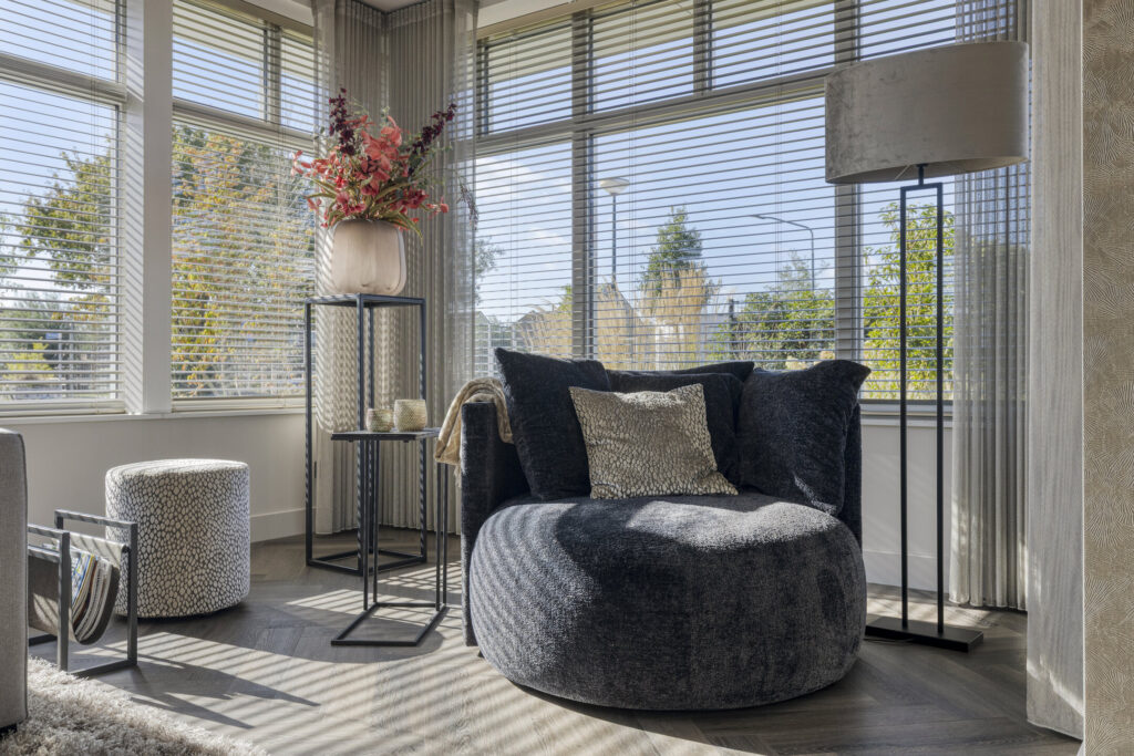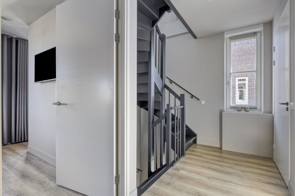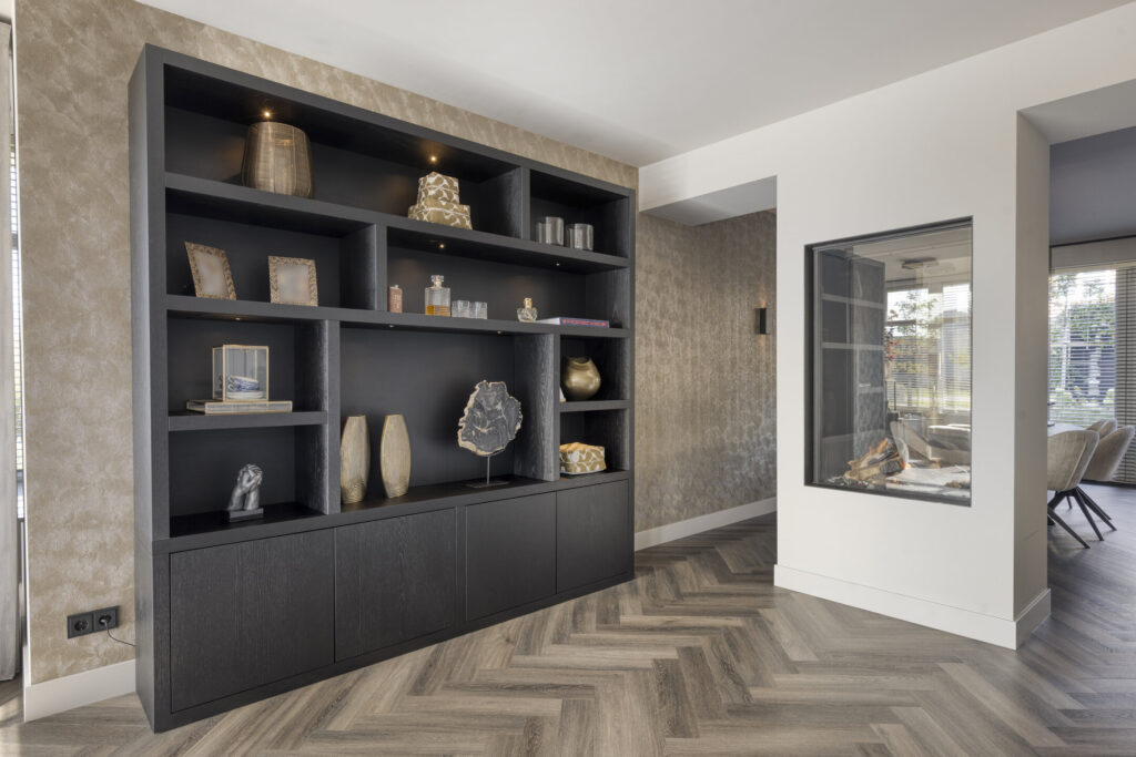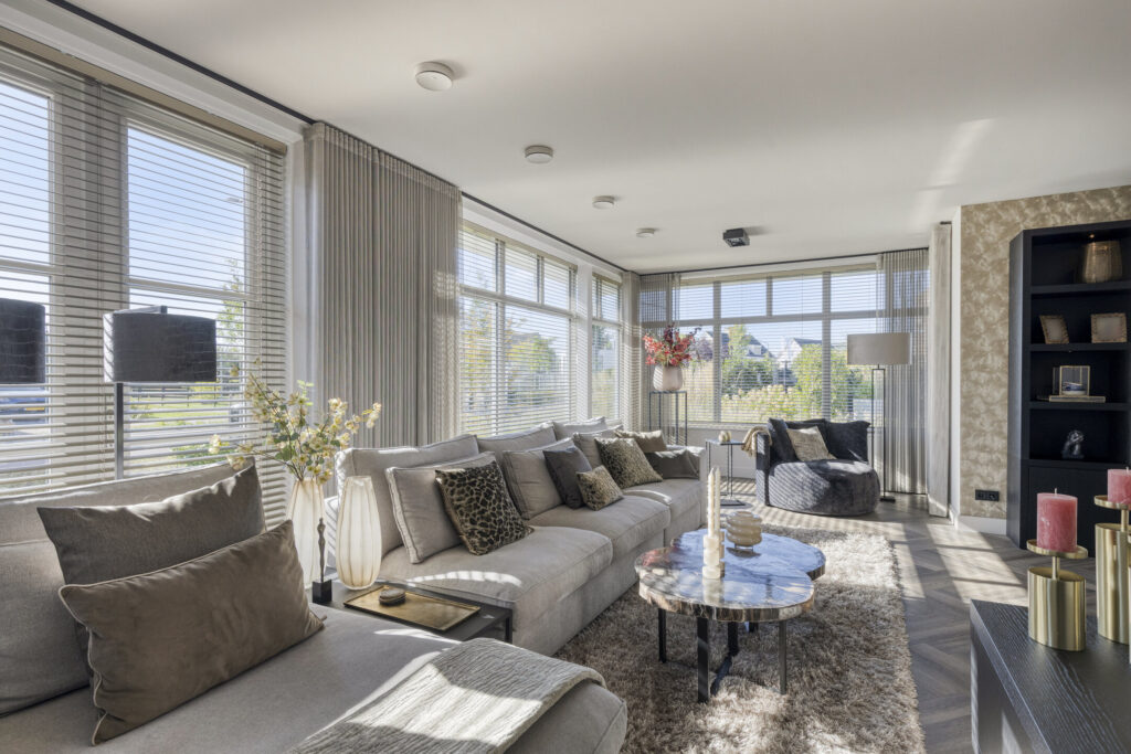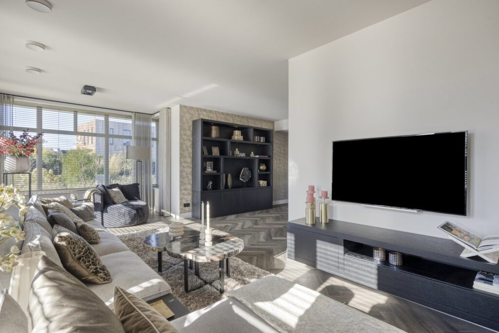 De entree zet meteen de toon: een lichte hal met een moderne trapopgang in zwart, een uitgebreide meterkast en een luxe toiletruimte met wandcloset en fonteintje. Hier ervaart u al de aandacht voor detail en de hoogwaardige afwerking die overal in de woning terugkomt. De woonkamer aan de voorzijde is een heerlijke leefruimte met raampartijen over de hele breedte waardoor een zee aan licht binnenvalt. De strakke wandafwerking in neutrale tinten zorgt voor een rustige basis en de sfeervolle “Dru” doorkijk gashaard maakt het geheel compleet. Deze ruimte ademt luxe en comfort, ideaal om te ontspannen of gasten te ontvangen.