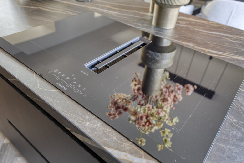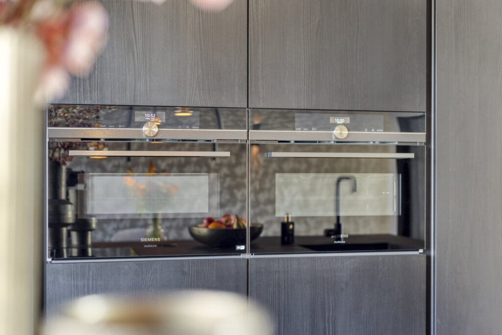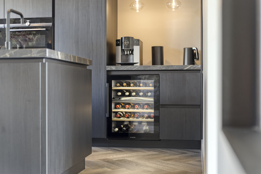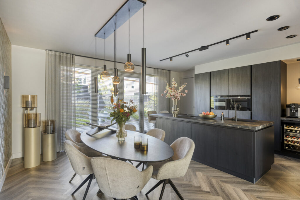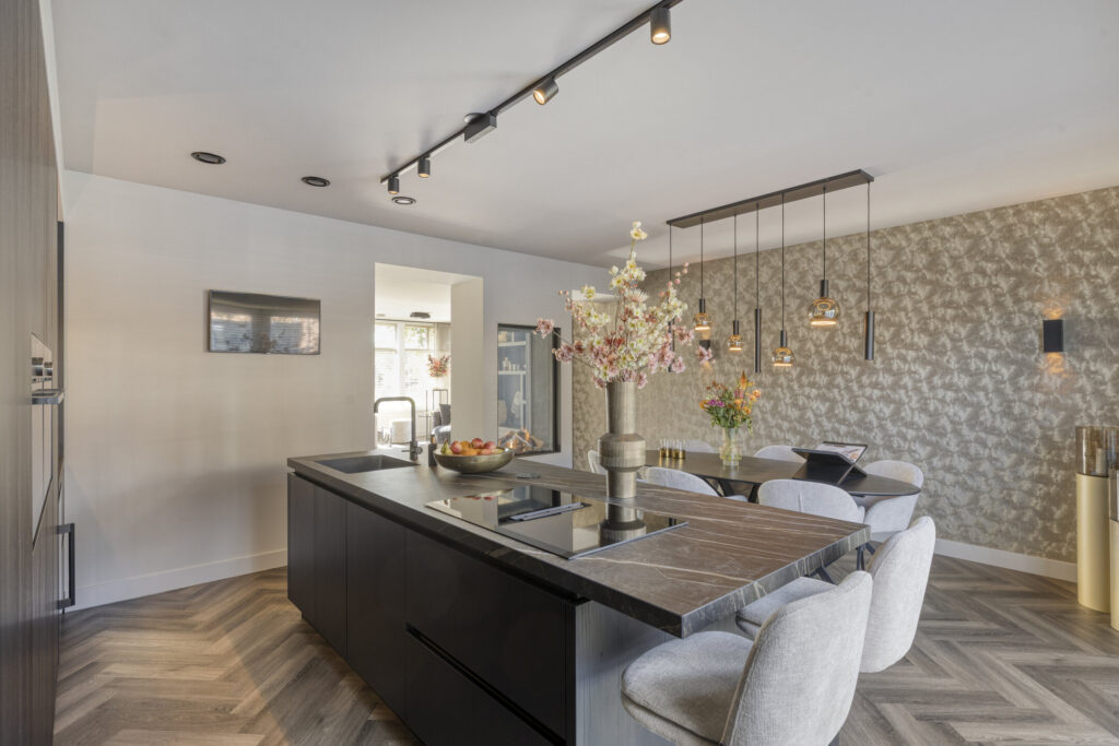 Aan de achterzijde van de woning bevindt zich de woonkeuken: een plek waar koken, tafelen en samen zijn centraal staan. Het kook-/spoeleiland, voorzien van een keramiek blad, is een echte blikvanger. Hier kookt u op een inductieplaat met geïntegreerde afzuiging en beschikt u over alle denkbare inbouwapparatuur zoals een grote koelkast met vershoudlades, vriezer, vaatwasser, combi-magnetron, oven, een wijnkoeler met dubbele-zone en een aparte koffiecorner. Via de openslaande deuren loopt u zo de tuin in. Vanuit de keuken bereikt u de volledig afgewerkte en geïsoleerde garage/multifunctionele ruimte. Met een tegelvloer, spoelblok en elektrische verwarming leent deze ruimte zich uitstekend voor gebruik als thuiswerkplek, hobbyruimte of praktijk. Openslaande deuren geven toegang tot de oprit en via een loopdeur is er een doorgang naar de tuin.