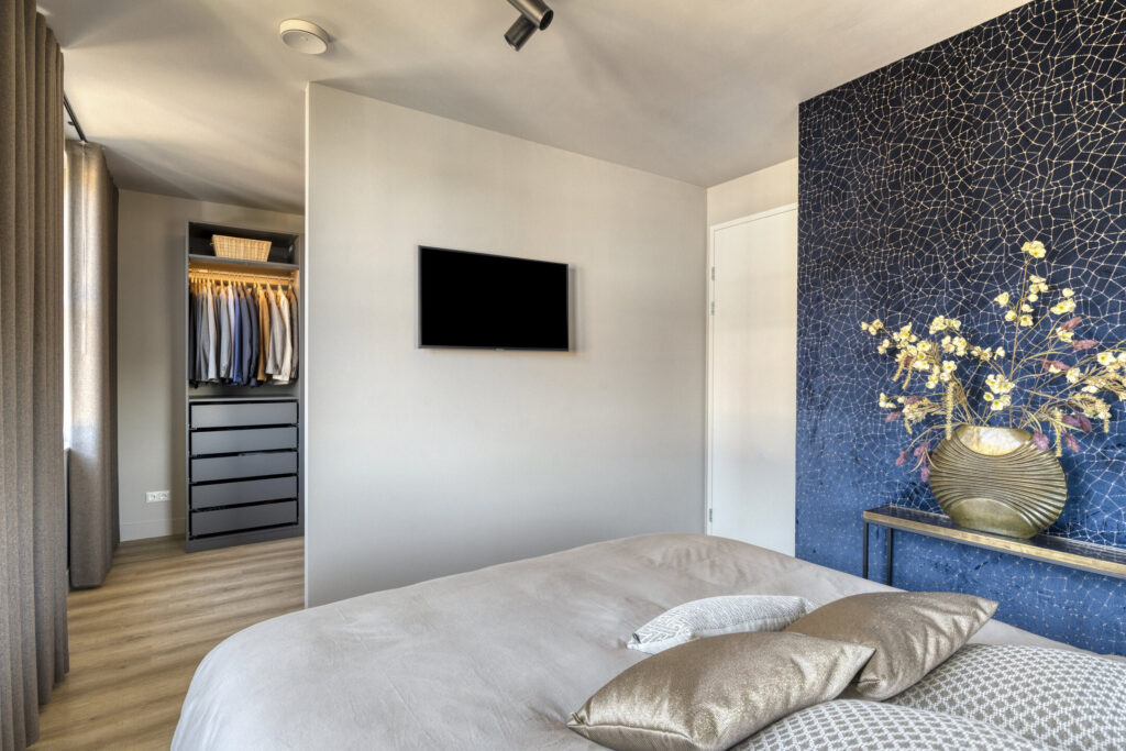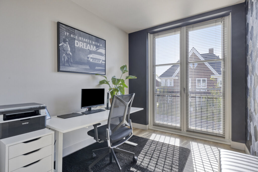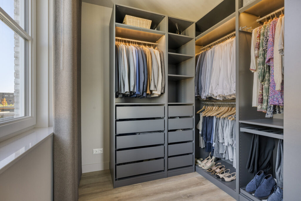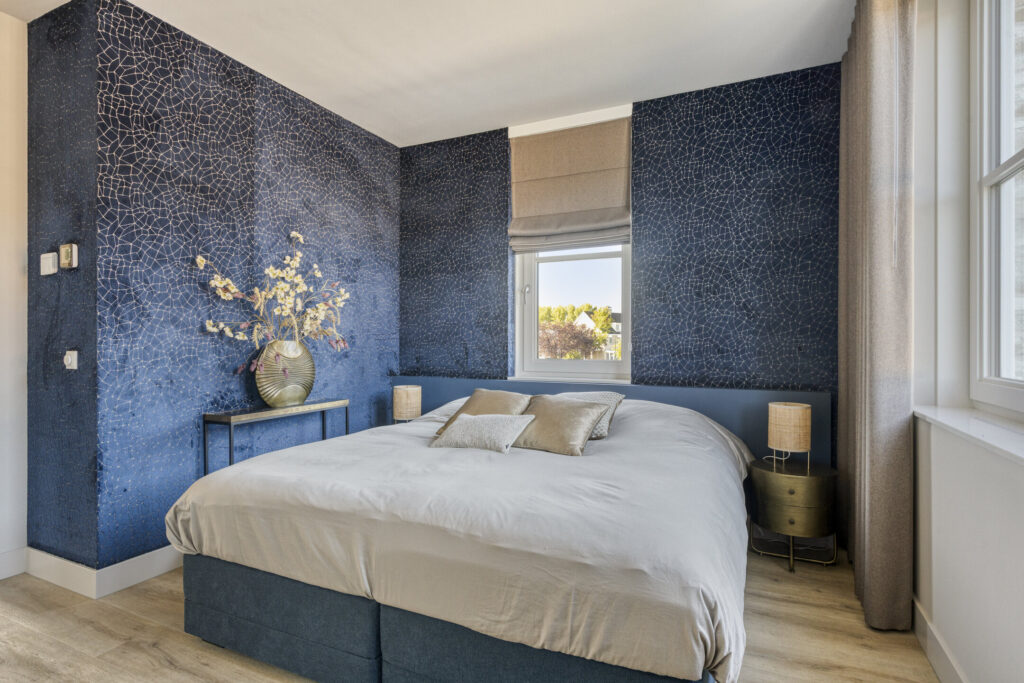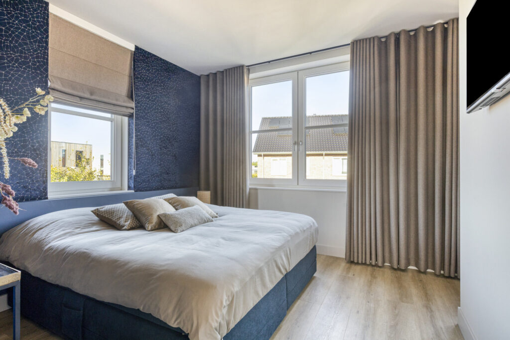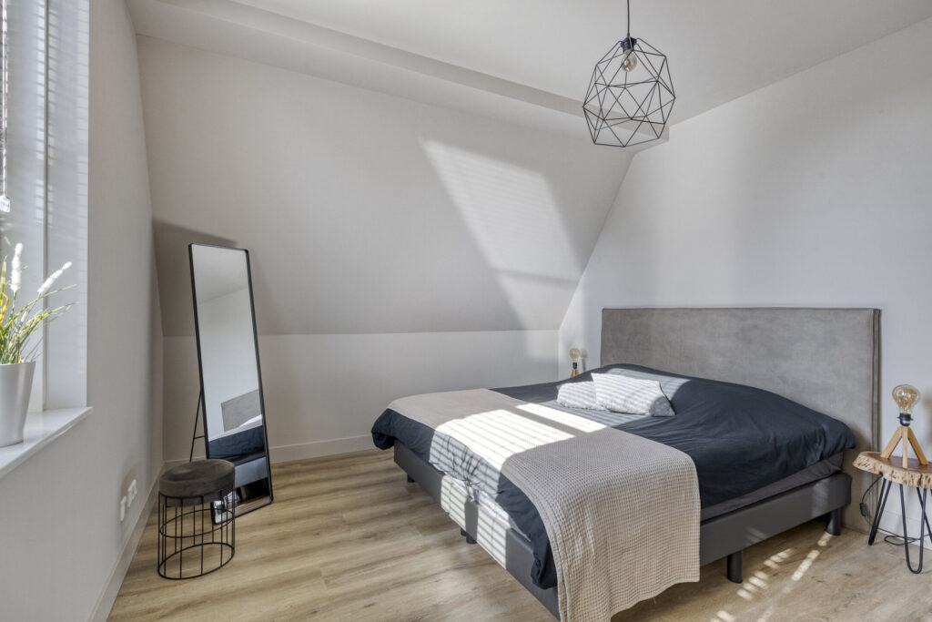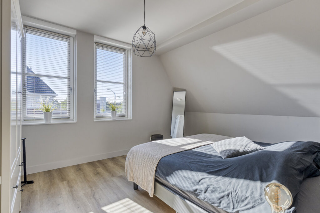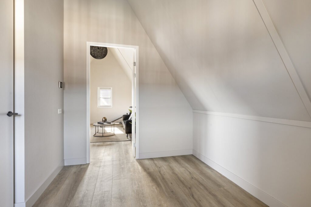 De eerste verdieping is ingericht met een ruime overloop, een separate toiletruimte en drie slaapkamers. De ouderslaapkamer is een pronkstuk: ruim, licht en voorzien van een eigen walk-in-closet. De overige kamers zijn eveneens strak afgewerkt met pvc-vloeren, vloerverwarming en glad stucwerk.
