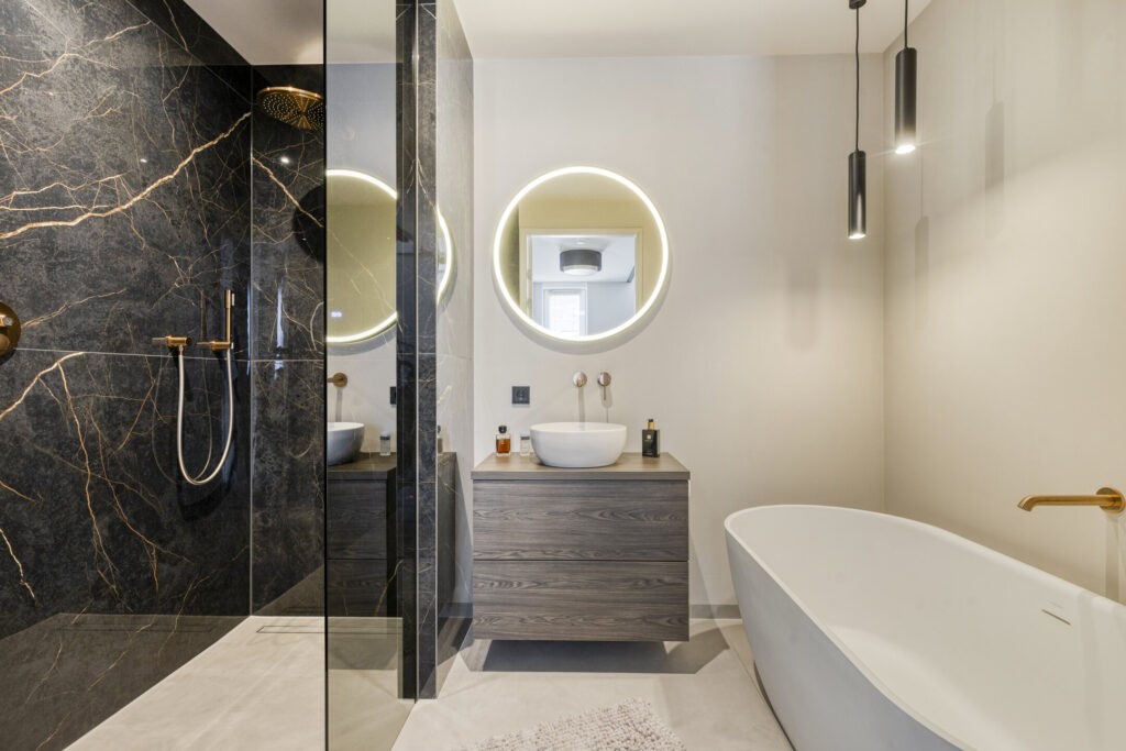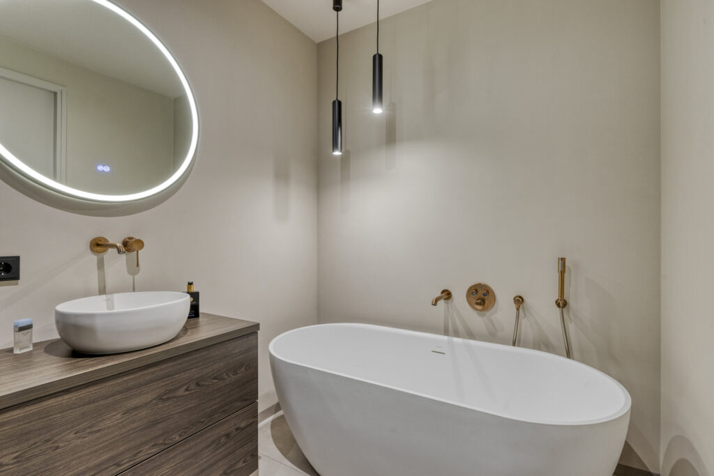 De badkamer ademt luxe en wellness. Hier vindt u een vrijstaand ligbad in mat composiet van het merk Detremmerie, een stijlvol meubel met waskom, verwarmde spiegel met verlichting, een design handdoekenradiator en een ruime inloopdouche met regendouche en handdouche. Grote moderne tegels, inbouwverlichting en hoogwaardige kranen maken het geheel tot een plek waar elke dag een beetje voelt als een spa-beleving.