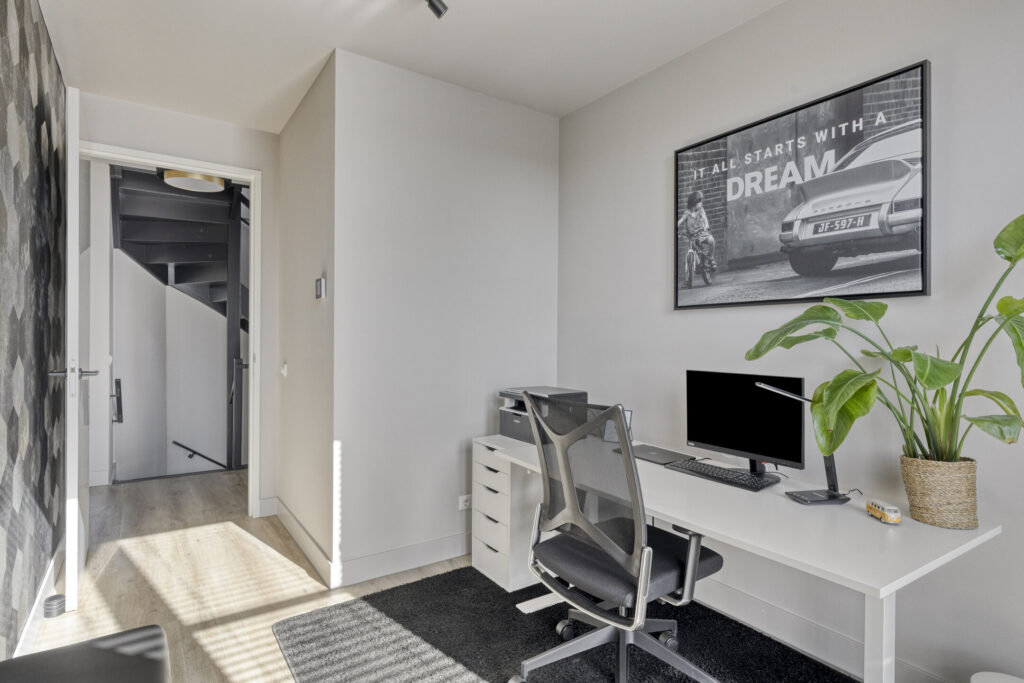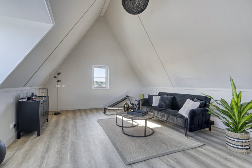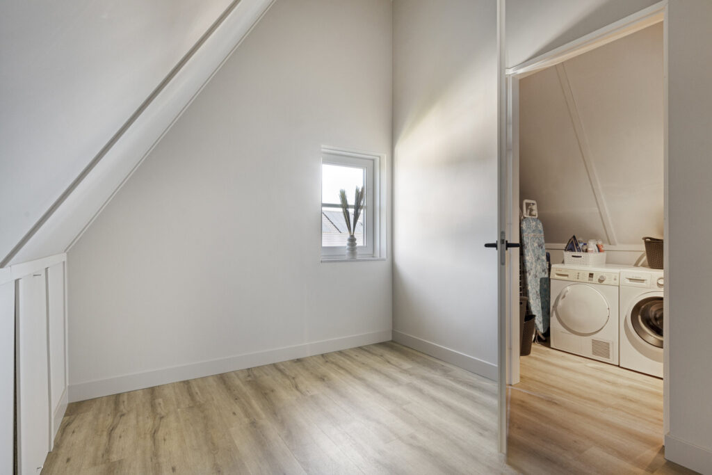 Op de tweede verdieping vindt u de technische ruimte met de moderne bodemwarmtepomp, een 200-liter boiler, de WTW-unit en aansluitingen voor de wasapparatuur. Daarnaast zijn er twee kamers: een compacte slaap-/werkkamer en een royale zolderkamer met dakkapel, pvc-vloer en bergruimte onder de knieschotten. De hoogte en het licht maken dit tot een bijzonder aangename extra leefruimte.