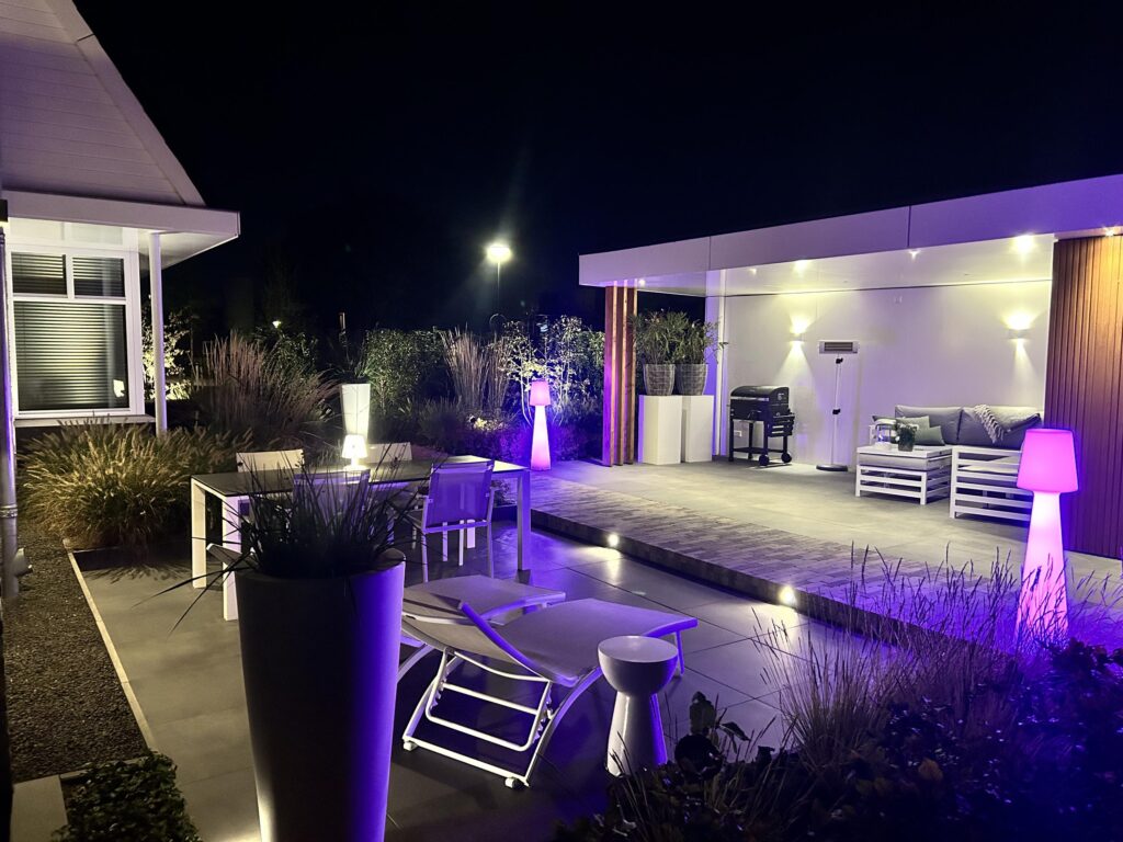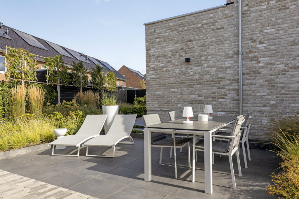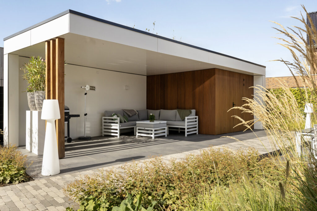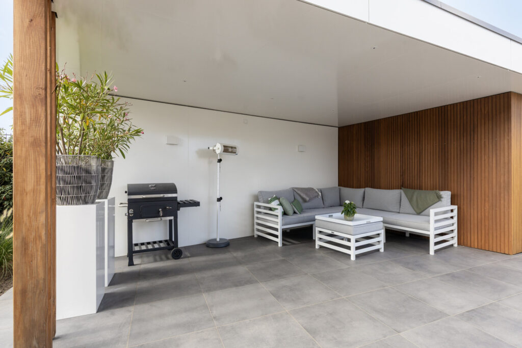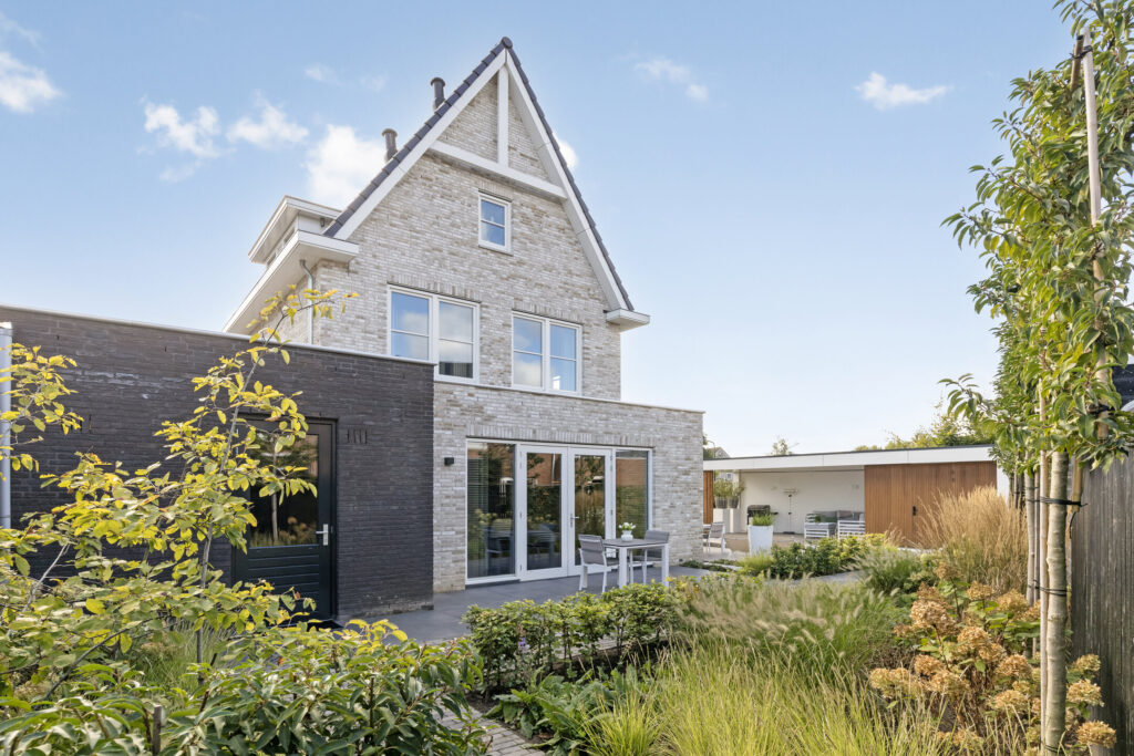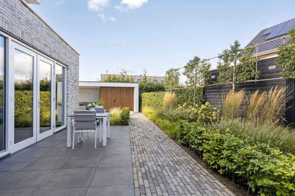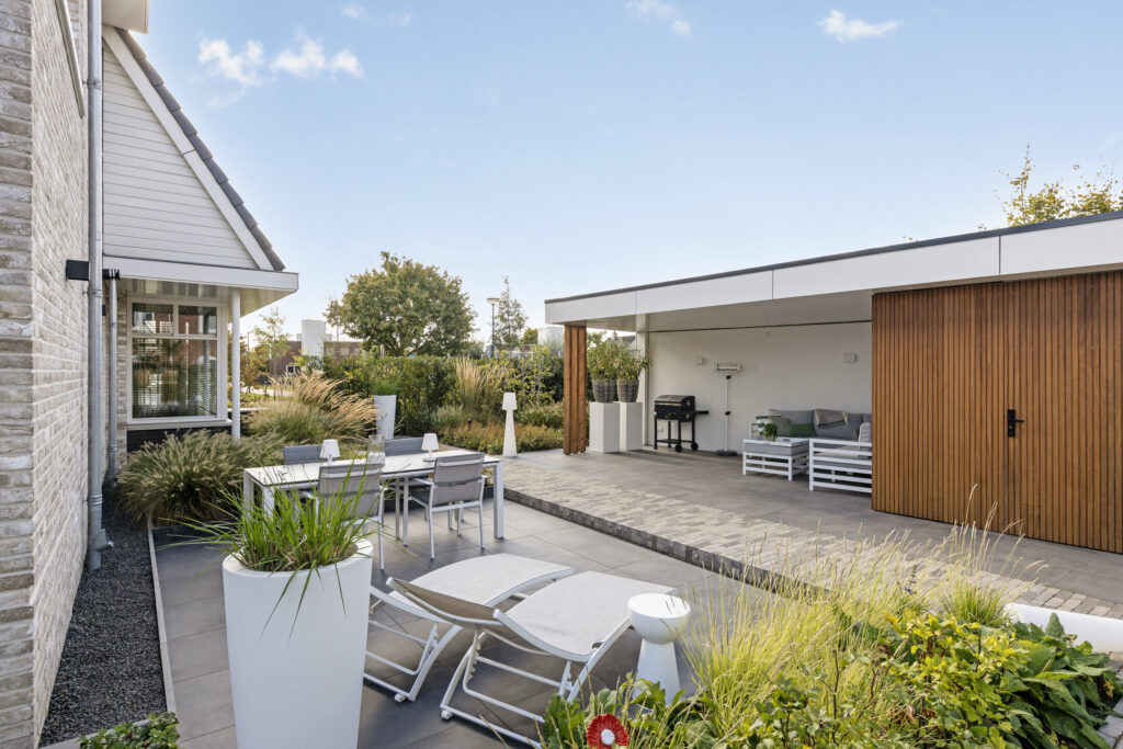 De tuin rondom de woning is strak en onderhoudsvriendelijk aangelegd. Grote terrastegels, groene borders en meerdere zithoeken maken het tot een heerlijke plek. Direct achter de woning is er ruimte voor een grote eettafel, verder vindt u een sfeervolle zitkuil en een prachtig overdekt terras met inbouwspots en wandverlichting. Een houten berging biedt ruimte voor fietsen en tuingereedschap, en dankzij de achterom is de tuin ook vanaf de brandgang bereikbaar.