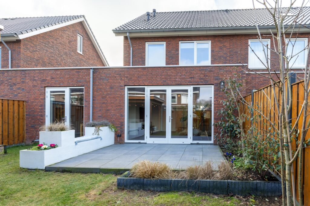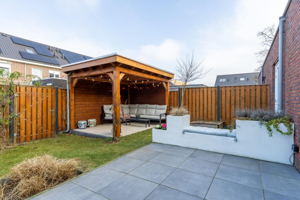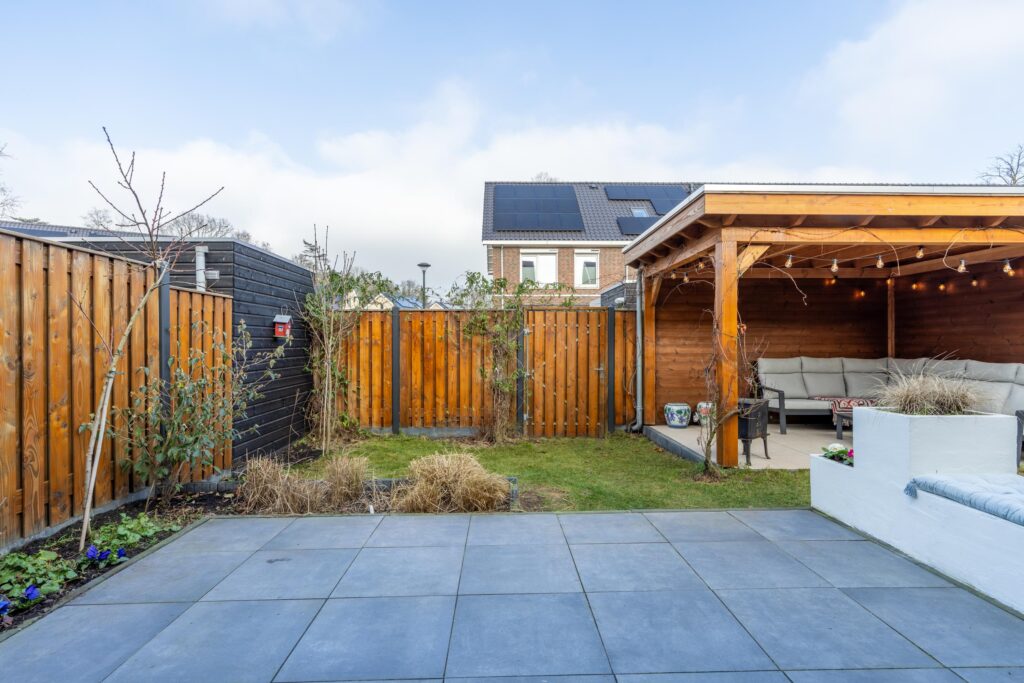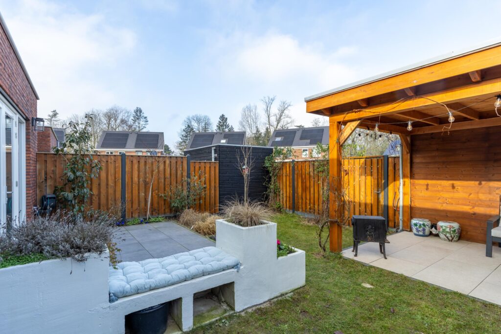 De achtertuin is onderhoudsvriendelijk aangelegd en beschikt o.a. over een achterom, een buitenkraan en een houten overkapping met geïsoleerd dak. Een fijne plek om het hele jaar door van het buitenleven te genieten. Aan de voorzijde ligt een voortuin met een oprit voor parkeren op eigen terrein.