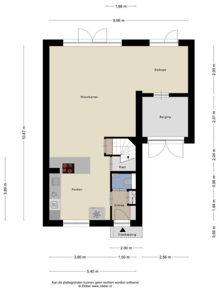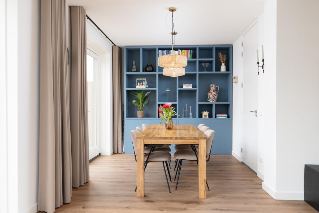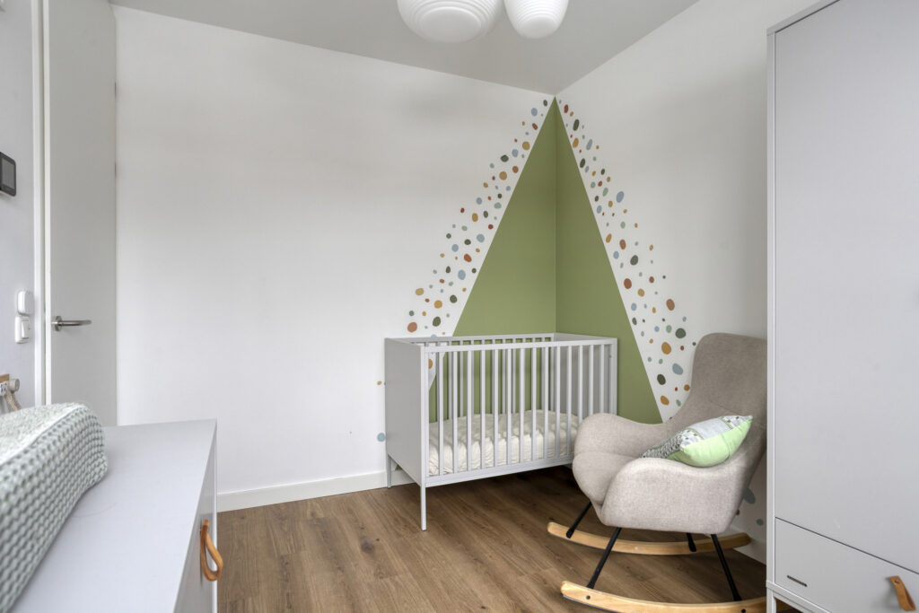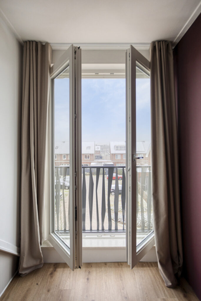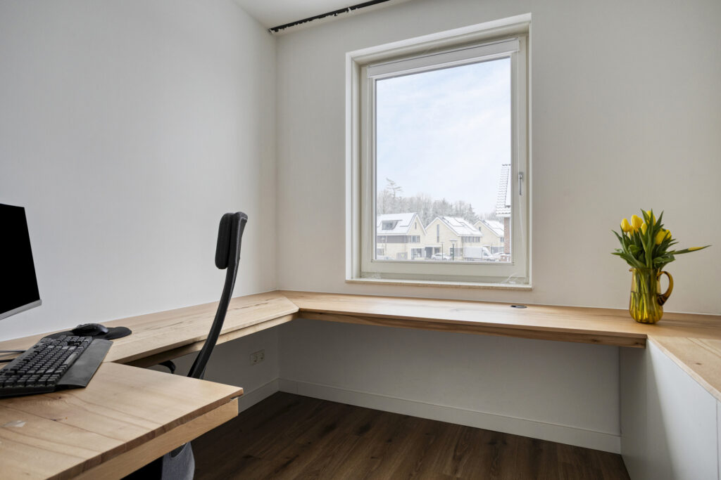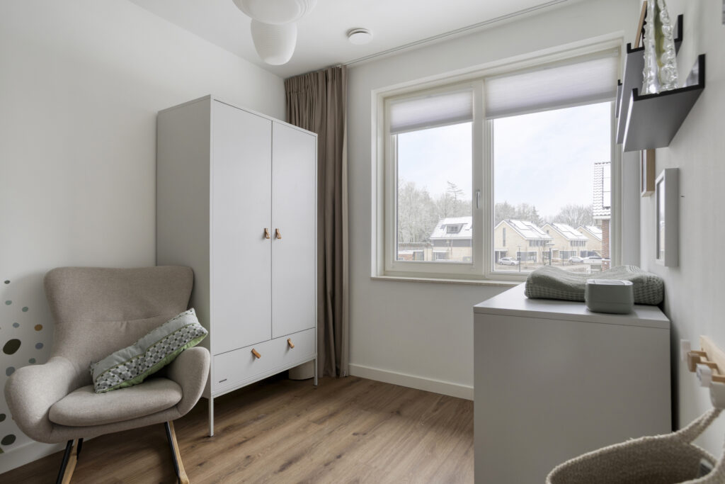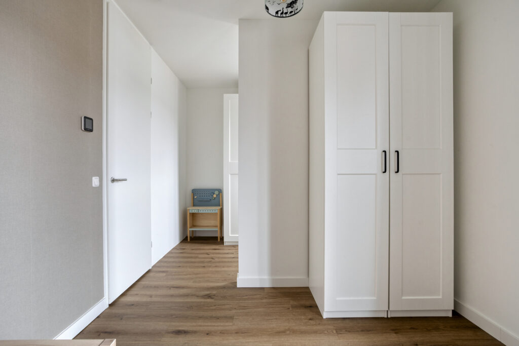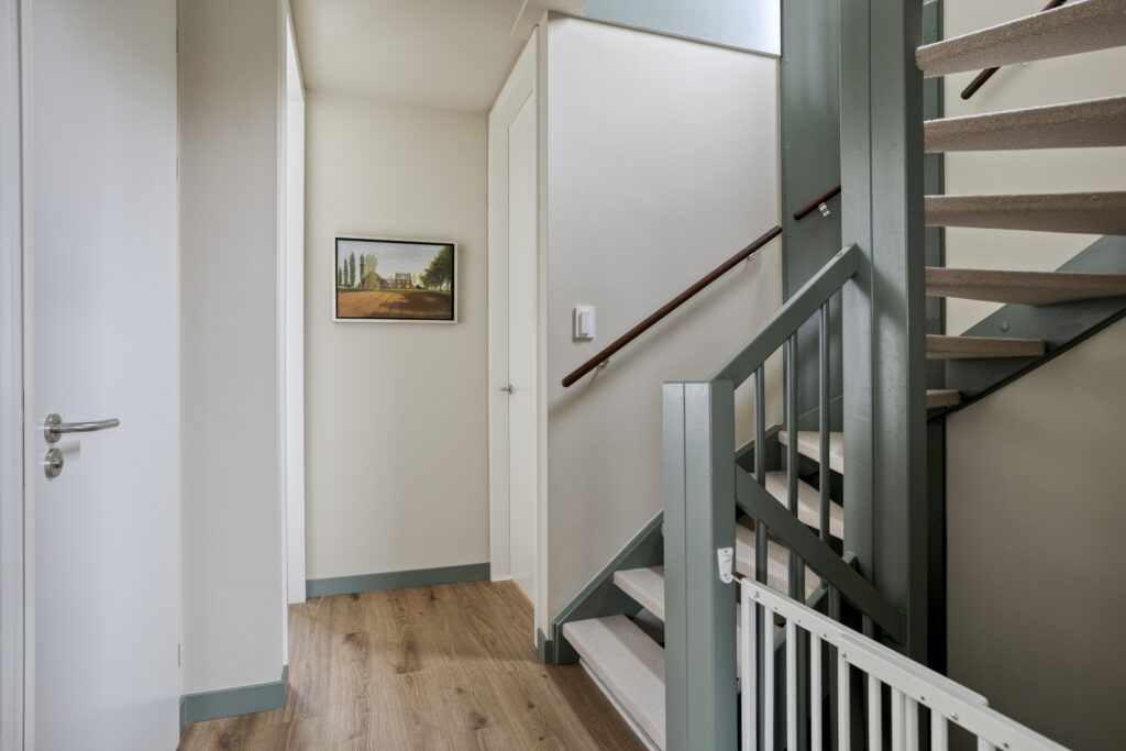 Via een brandwerende binnendeur bereik je de berging. Deze is aan de zijde van de oprit voorzien van dubbele deuren, ideaal voor fietsen en extra opslag. De gehele begane grond is afgewerkt met een neutrale pvc-vloer met vloerverwarming en -koeling. Wanden en plafonds zijn glad gestuukt en afgewerkt in lichte kleuren. Daarnaast is er een praktische trapkast en een afgesloten trapopgang naar de eerste verdieping.