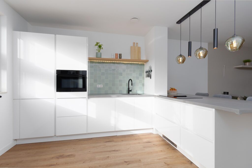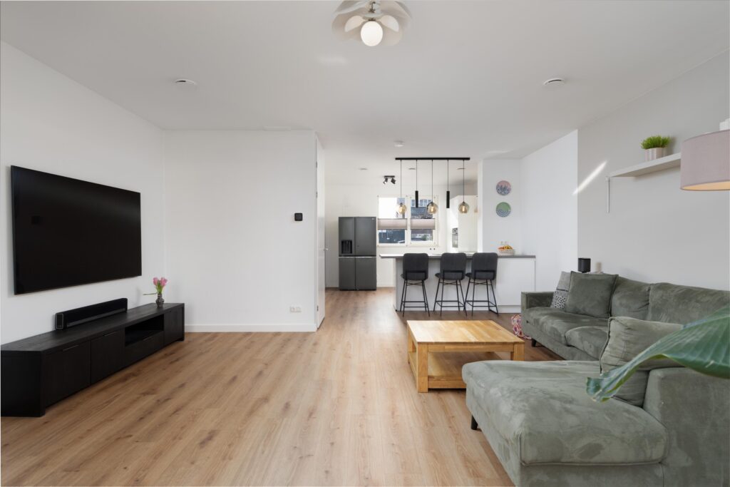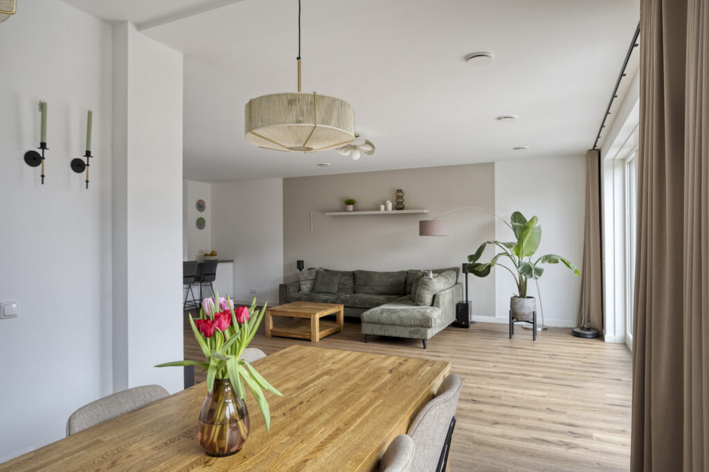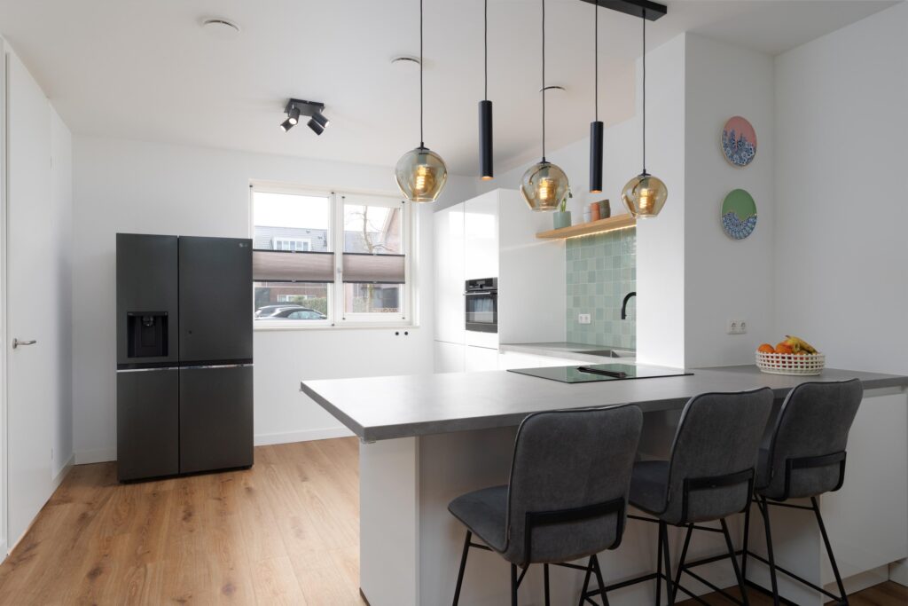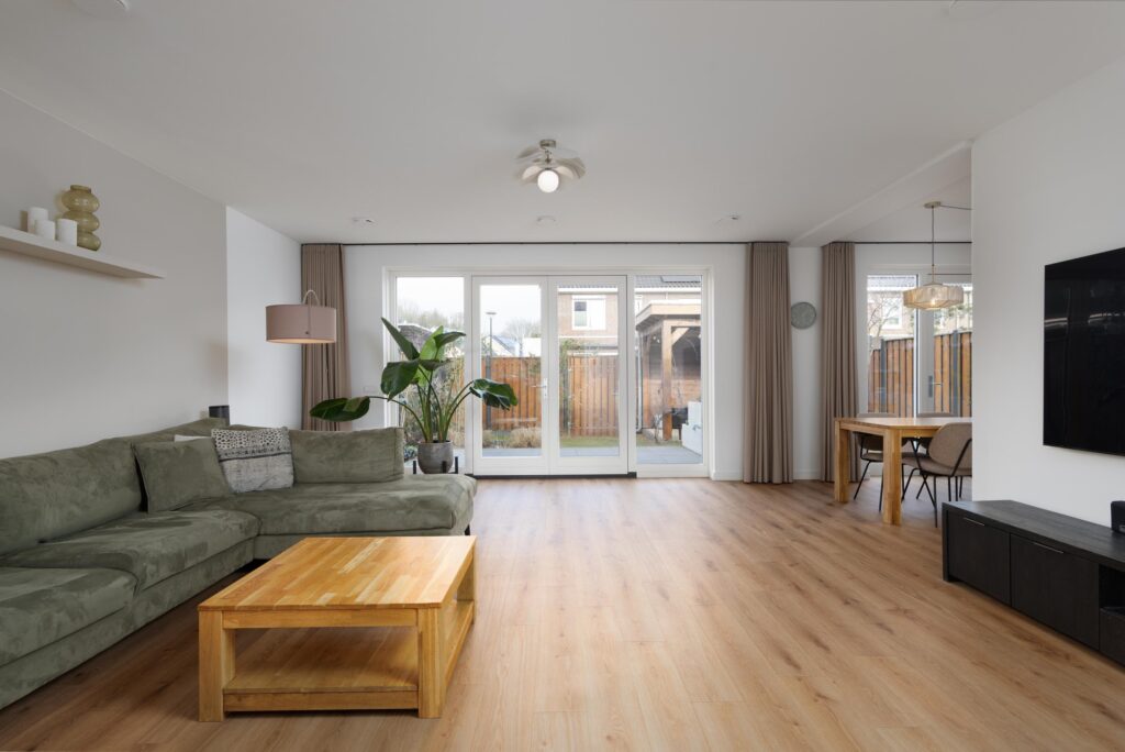 Je betreedt de woning via de ruime keuken aan de voorzijde. Deze is ingericht met een witte hoekopstelling en met diverse inbouwapparatuur, waaronder een oven, vaatwasser en een inductiekookplaat met geïntegreerde afzuiging. Daarnaast is er een grote spoelbak met Quooker-kraan voor direct heet water. De losstaande koel-/vriescombinatie met wateraansluiting is ter overname. Er is volop kastruimte aanwezig en het lichtgrijze composiet werkblad biedt aan de woonkamerzijde een zitgelegenheid. De royaal uitgebouwde woonkamer is heerlijk licht en biedt volop leefruimte. Het zitgedeelte staat in open verbinding met de eetkamer aan de achterzijde, die zich ook uitstekend leent als speel- of werkhoek. Zowel vanuit het zitgedeelte als vanuit de eetkamer geven openslaande deuren directe toegang tot de tuin.