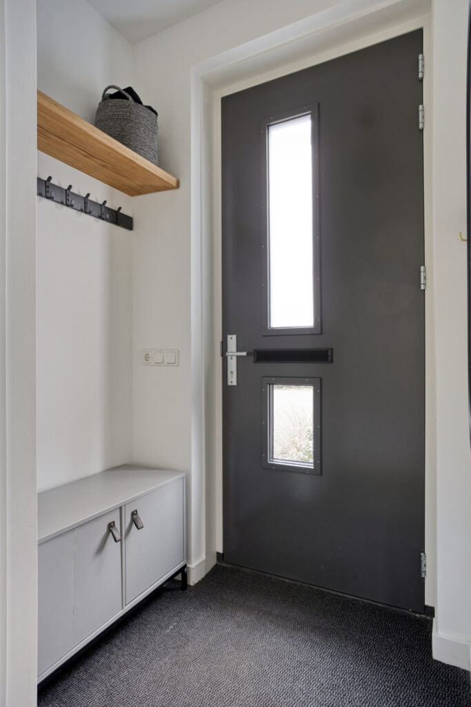 Via het pad naar de voordeur kom je bij de entree van de woning. De hal is verzorgd afgewerkt met een neutrale pvc-vloer, garderobehoek en uitgebreide meterkast. Vanuit hier is er toegang tot de moderne toiletruimte, uitgevoerd met een wandcloset en fonteintje.