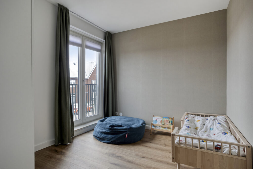 Op de eerste verdieping bevinden zich drie slaapkamers en de badkamer. De overloop en slaapkamers zijn allen afgewerkt met een pvc-vloer met vloerverwarming en -koeling en beschikken over draai-/kiepramen met triple beglazing in houten kozijnen. Dankzij de zone-regeling is de vloerverwarming per kamer afzonderlijk instelbaar.