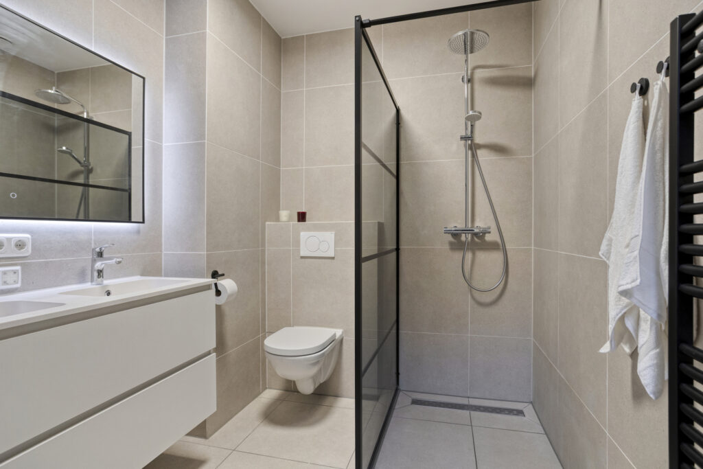 De moderne badkamer is compleet uitgevoerd met een inloopdouche met stort- en handdouche, een wandcloset, een dubbele wastafel met ladekast, een handdoekenradiator en vloerverwarming. De spiegel is voorzien van verlichting en verwarming en er is mechanische afzuiging aanwezig.