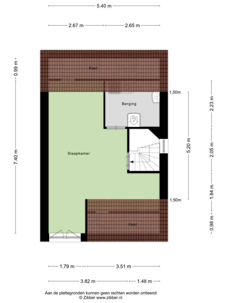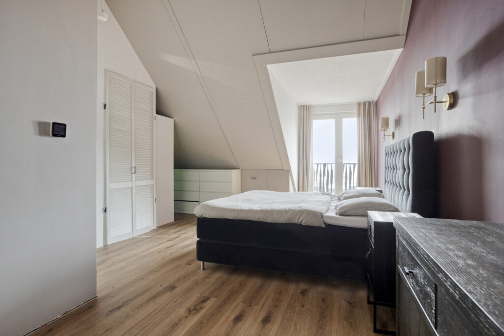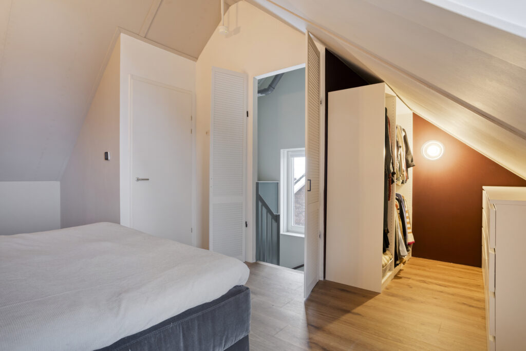 De tweede verdieping is momenteel ingericht als een royale master bedroom. Ook hier ligt een pvc-vloer met vloerverwarming en -koeling. Een dakkapel met openslaande raampartijen en een Frans balkon zorgt voor veel licht en een ruimtelijk gevoel. Achter de knieschotten is volop bergruimte aanwezig. Een afgesloten technische ruimte biedt plaats aan de bodem-warmtepomp, WTW-installatie, aansluitingen voor wasapparatuur en de omvormer van de 10 zonnepanelen.