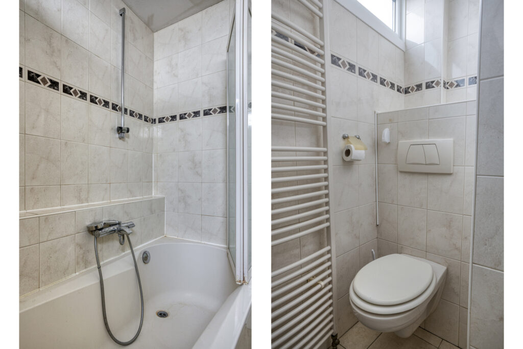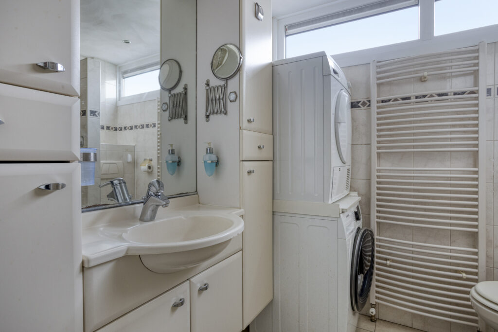 De badkamer is volledig betegeld en ingericht met een ligbad met douchescherm, wandcloset, wastafel met meubel en aansluitingen voor wasapparatuur. Daarnaast is er mechanische afzuiging en inbouwverlichting aanwezig.