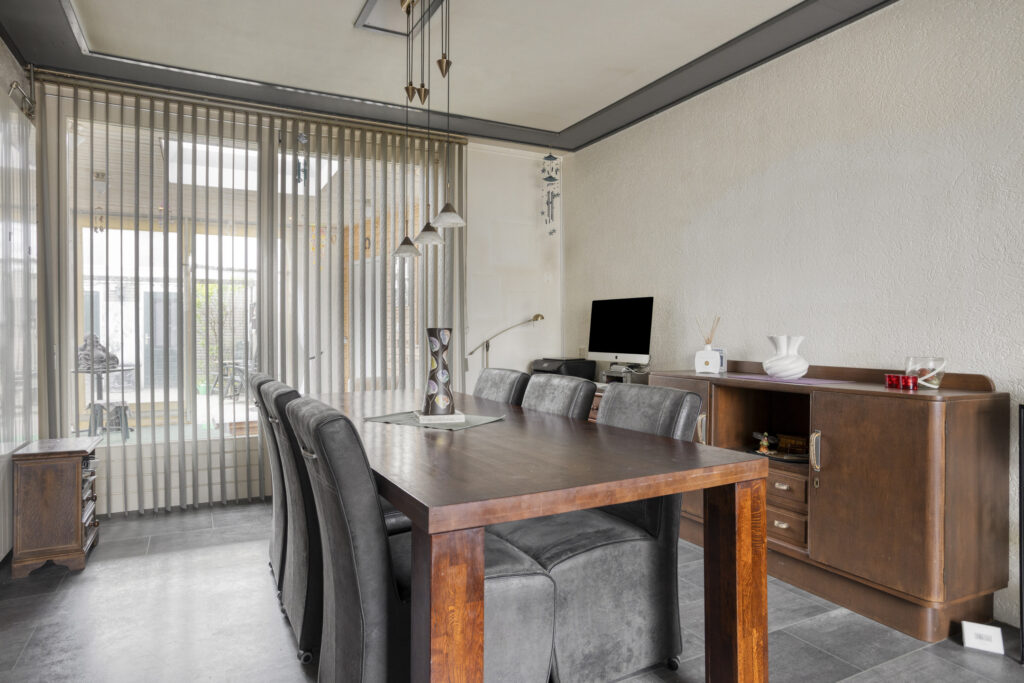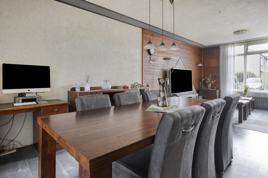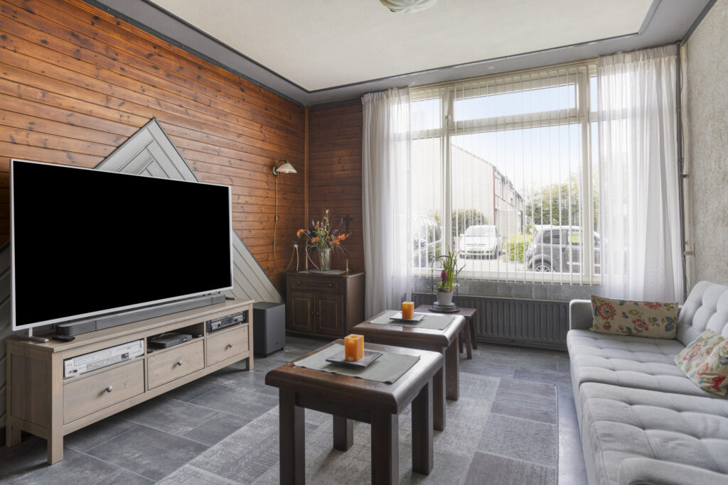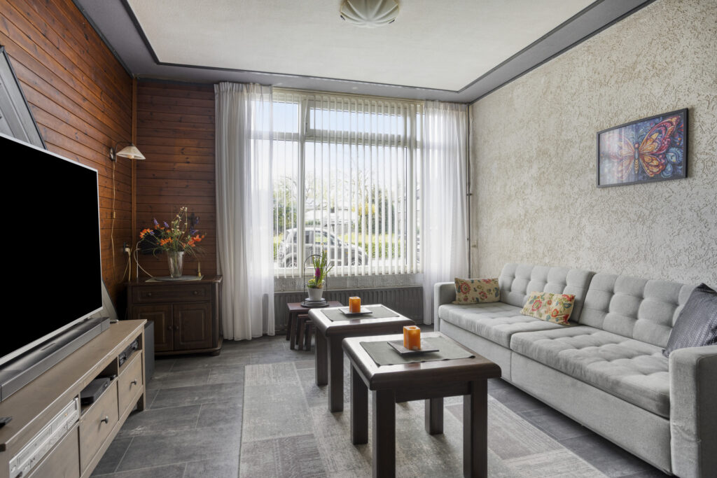 De doorzonwoonkamer heeft dankzij de grote raampartij aan de voorzijde, met kunststof kozijnen en HR++ beglazing, veel natuurlijk lichtinval. Aan de tuinzijde bevindt zich een schuifpui (hout, eveneens met HR++ glas).