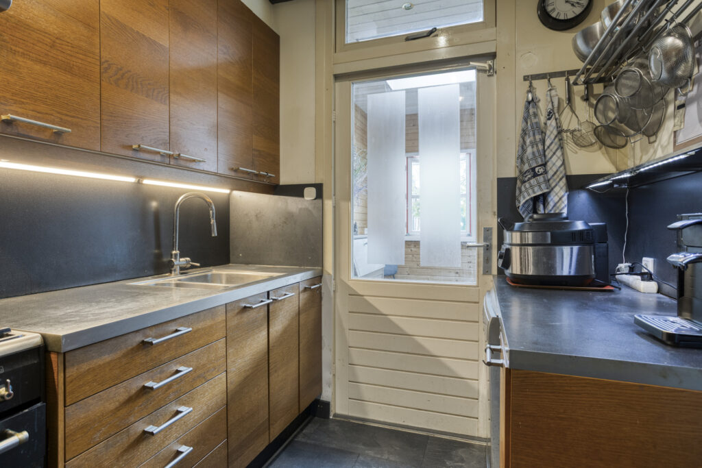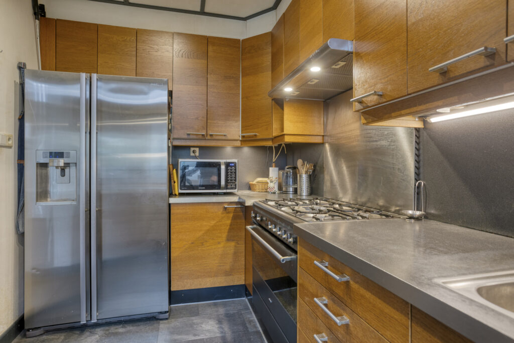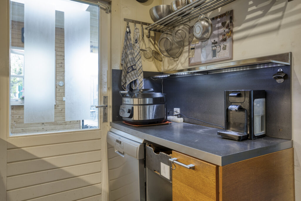 De vloer is afgewerkt met laminaattegels (gelegd over een tegelvloer), en wanden zijn deels voorzien van granol en deels van houten wandpanelen. Via een toog staat de keuken in open verbinding met de woonkamer. Deze is ingericht met een hoek- en rechte wandopstelling en beschikt over een grote gaskookplaat met oven. Via een achterdeur is er een directe toegang tot de overkapping.