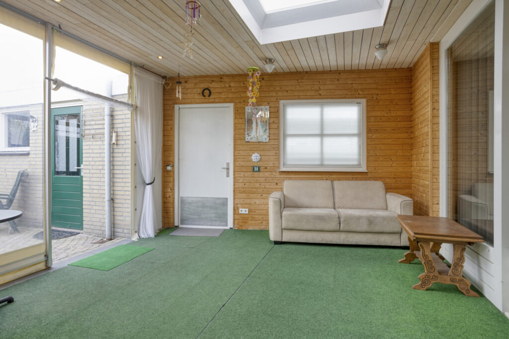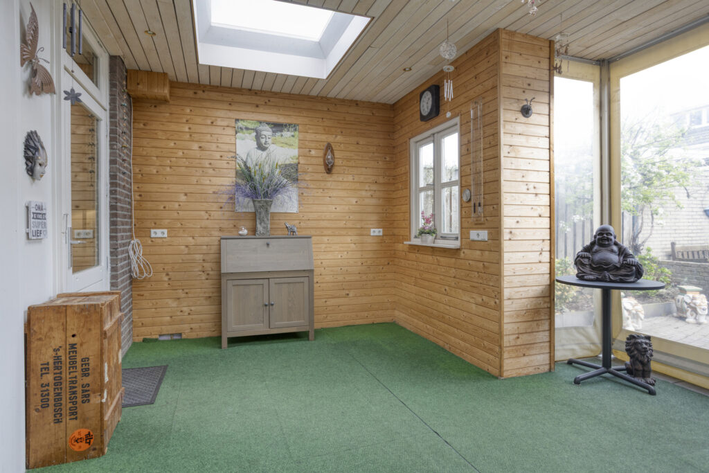 De voortuin is verzorgd aangelegd met kunstgras gazonnetjes en een diepe oprit met ruimte voor meerdere auto’s. Vanaf de oprit is er via een poort een achterom naar de overkapping direct achter de woning. Deze royale overkapping met tegelvloer is een mooie verlenging van de woonkamer. Door middel van twee lichtkoepels en twee raampartijen met dubbele beglazing is er volop lichtinval. Het geheel kan desgewenst worden afgesloten met kunststof doeken.