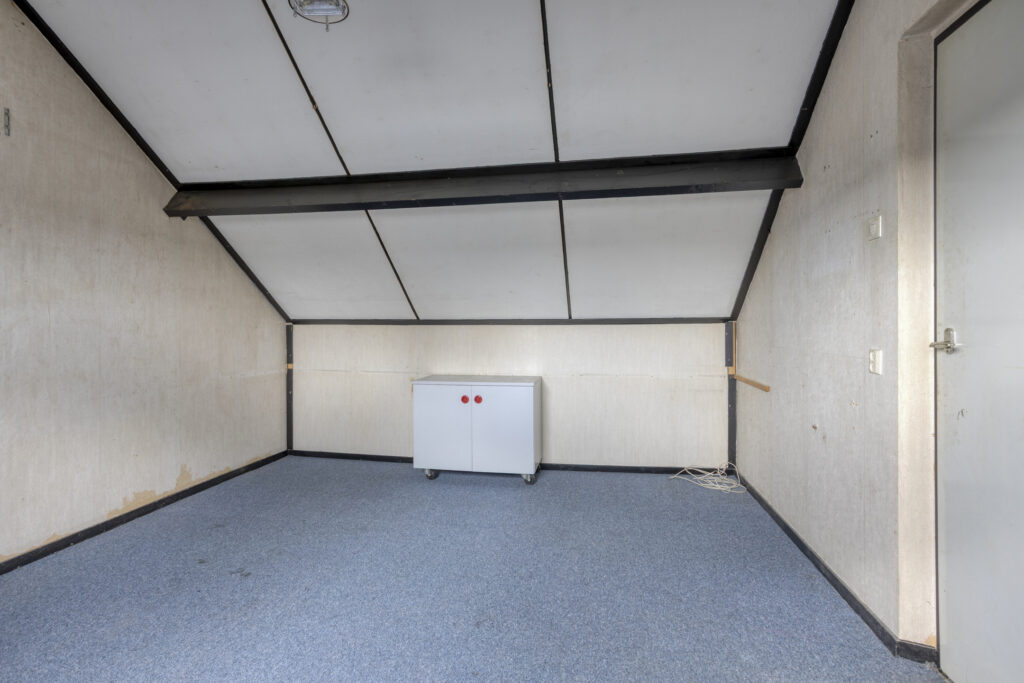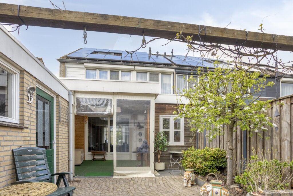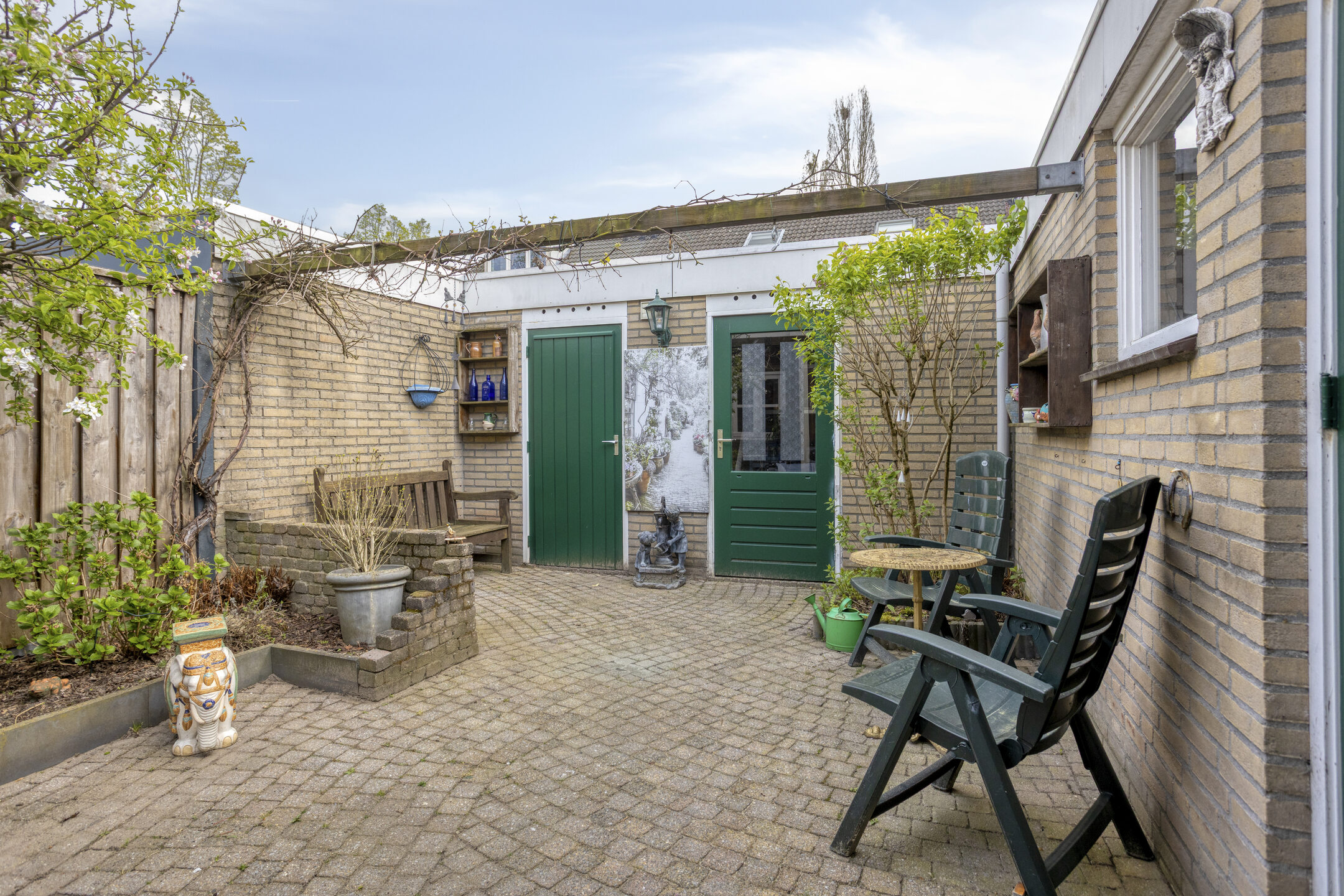 De achtertuin is grotendeels bestraat en daardoor onderhoudsvriendelijk, met daarnaast een border met diverse beplanting en een appelboom. Achterin bevinden zich twee bergingen: één voor tuingereedschap en één voor fietsen. De ruime garage is voorzien van een stalen kanteldeur en beschikt over een gootsteen met koud water.