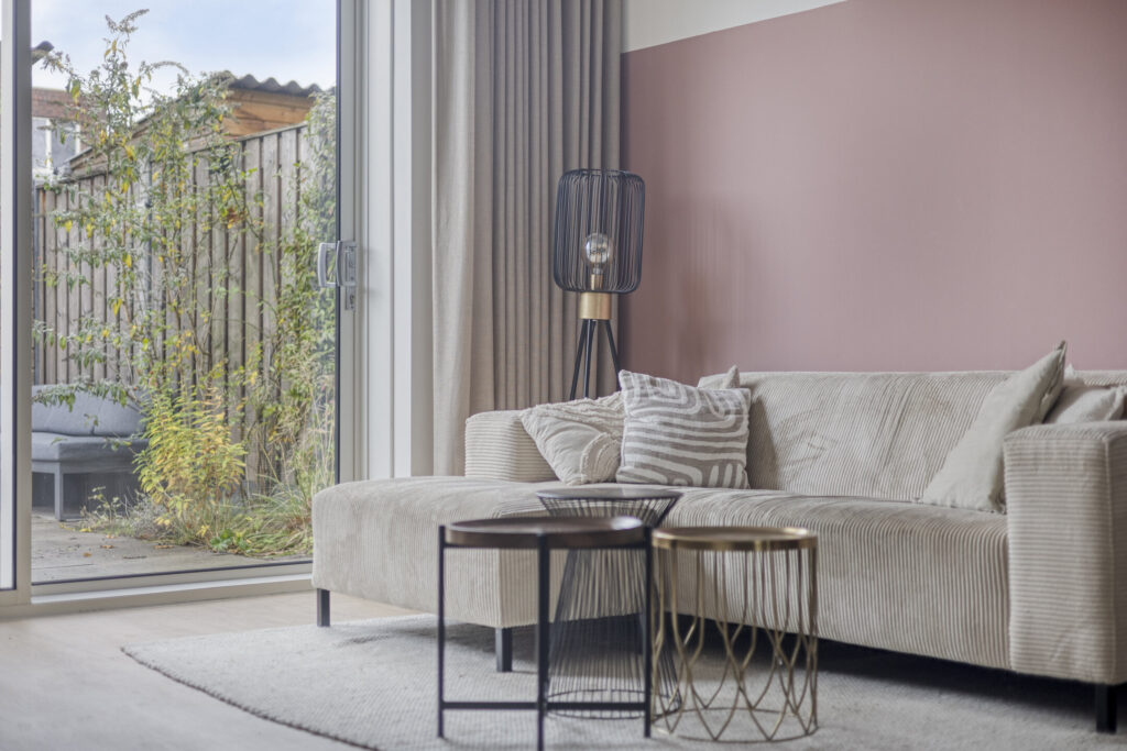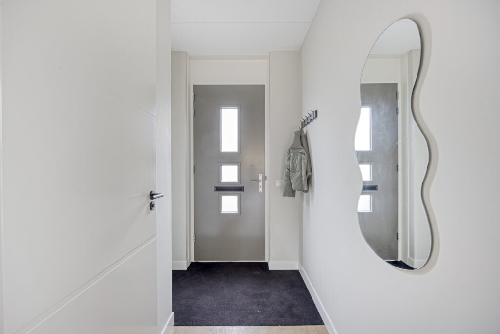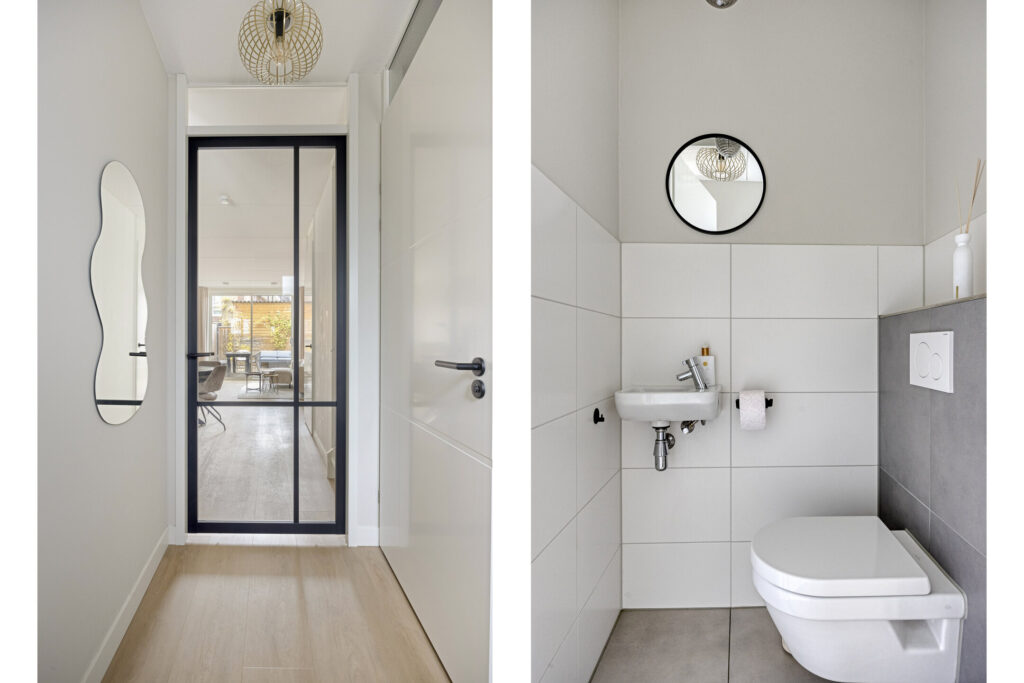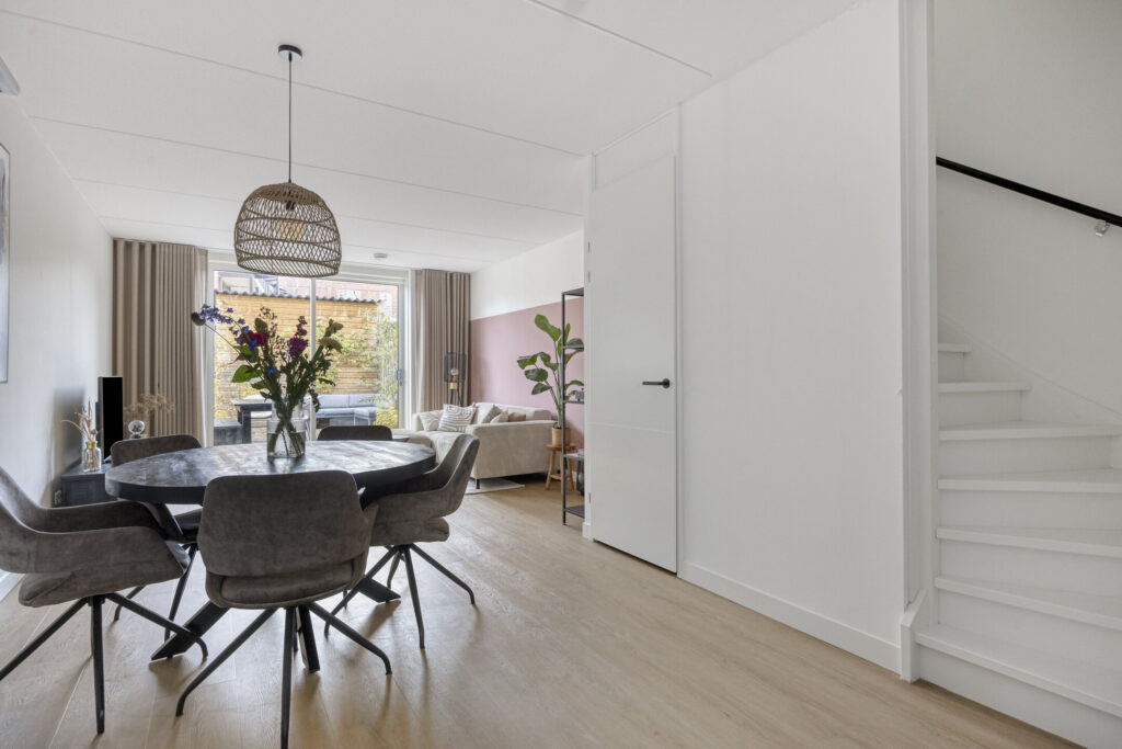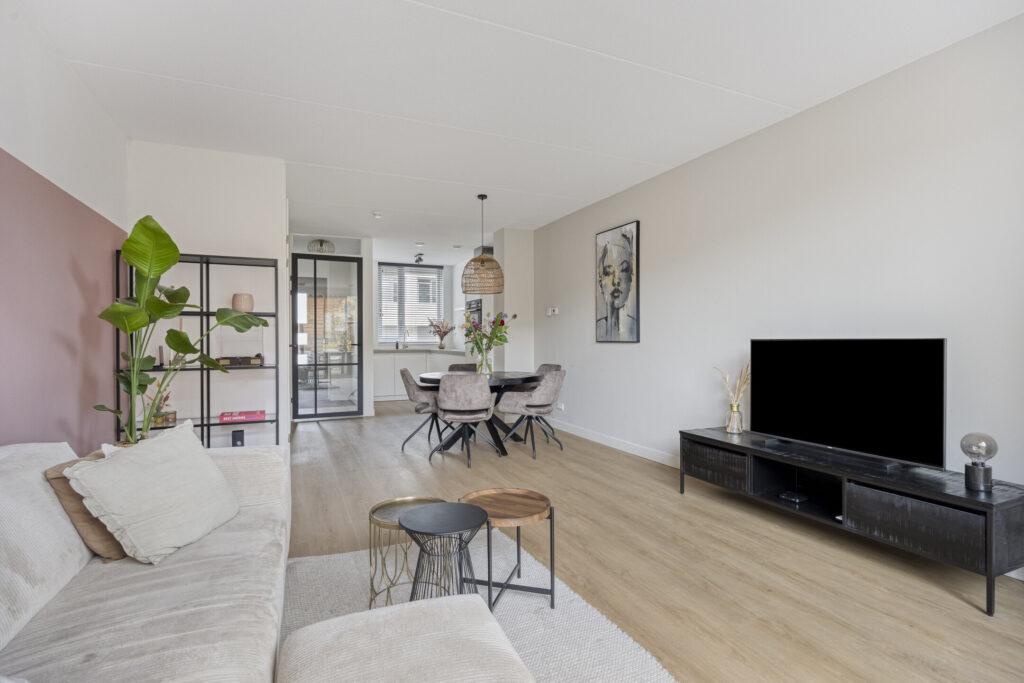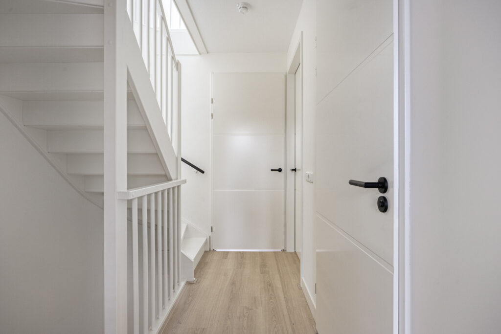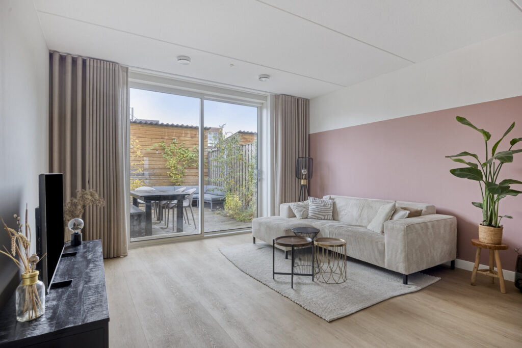 Via de hal, voorzien van pvc-vloer, meterkast en modern toilet met wandcloset en fonteintje, bereik je de woonkamer. De deur met glasinzet zorgt direct voor een prettige lichtinval. De tuingerichte woonkamer voelt ruim en licht aan en beschikt over een praktische trapkast. Aan de achterzijde biedt de aluminium schuifpui toegang tot de tuin. De pvc-vloer met vloerverwarming zorgt voor een strak en comfortabel geheel; alle wanden zijn glad en in neutrale tinten afgewerkt.