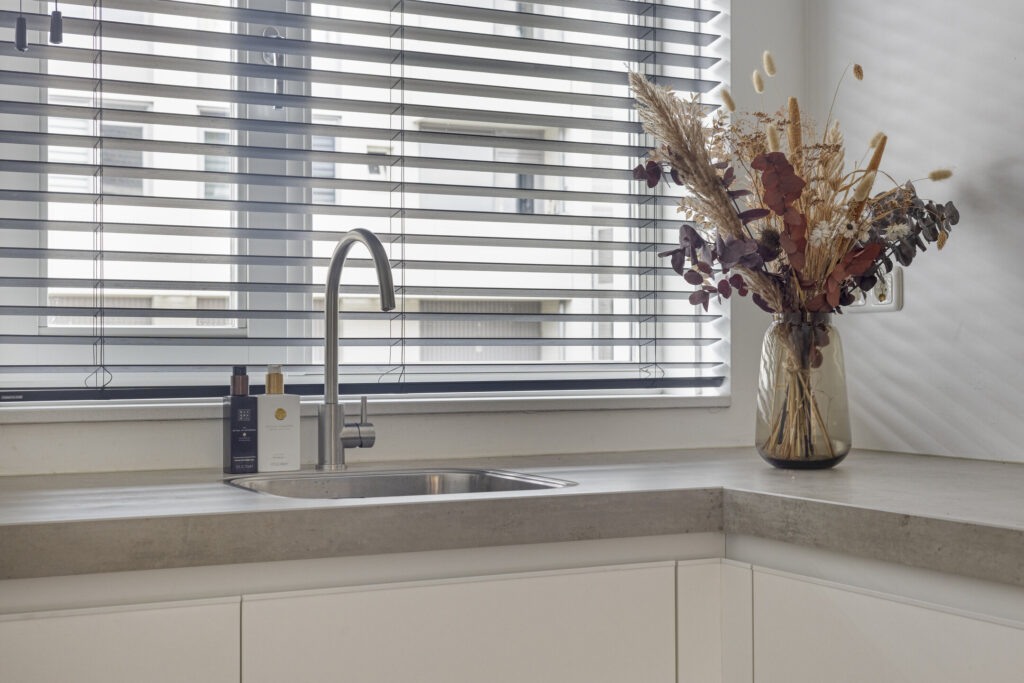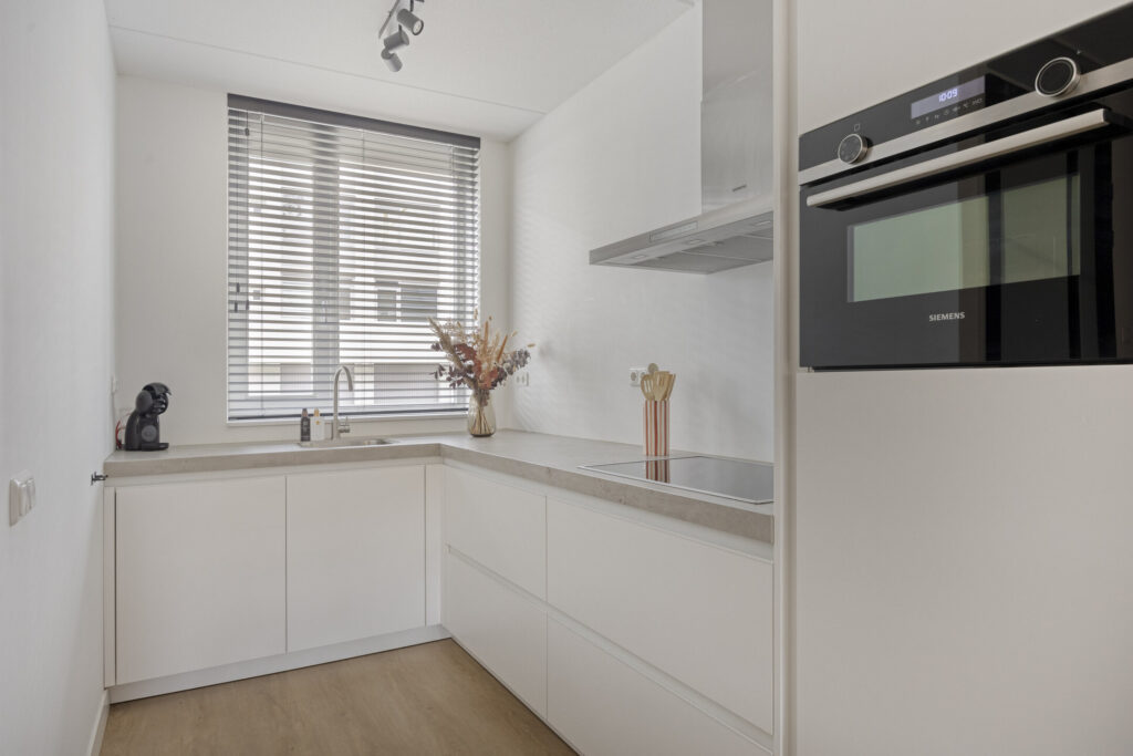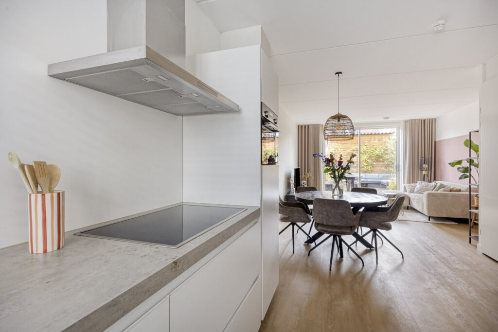 De moderne keuken aan de voorzijde is uitgevoerd in een greeploze hoekopstelling en beschikt over brede lades en volop kastruimte. De keuken is uitgerust met een inductiekookplaat, afzuigkap, koelkast, vaatwasser en een stijlvol keramiek werkblad: een fijne plek voor kookliefhebbers.