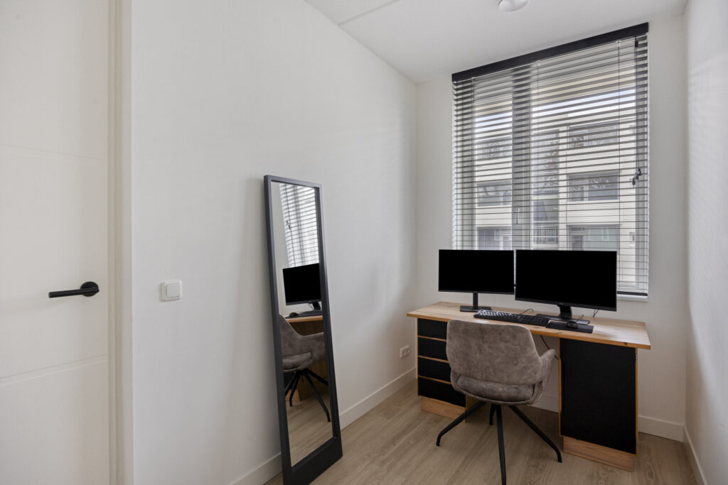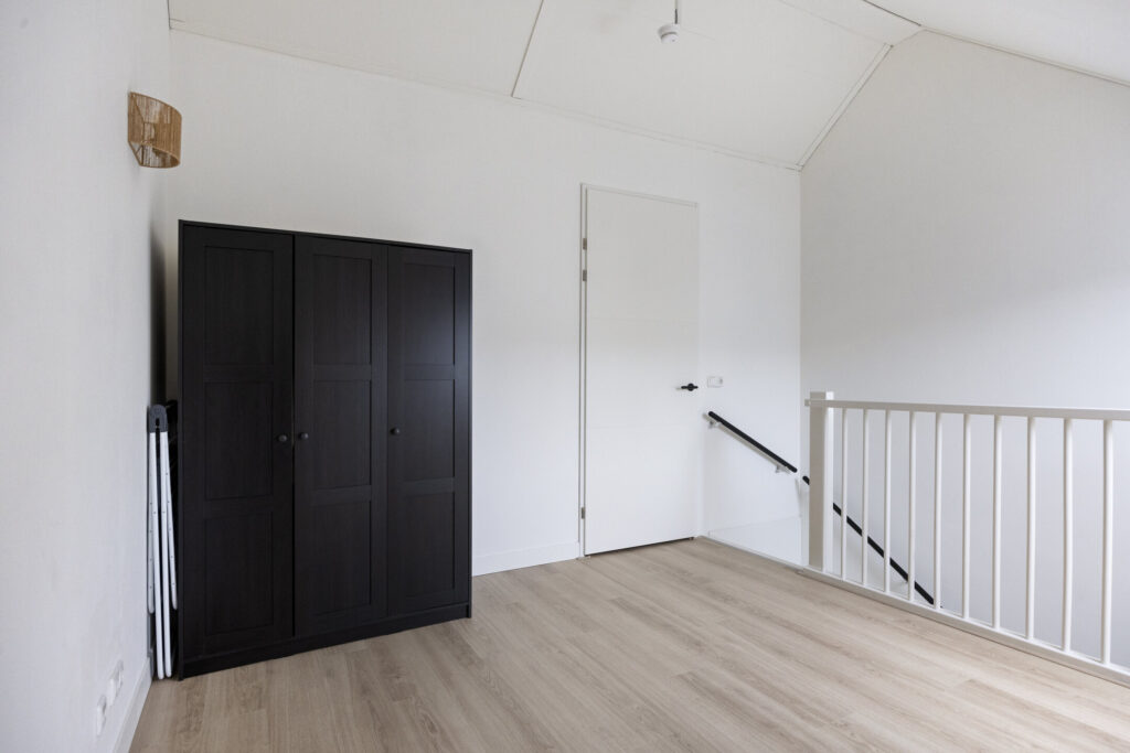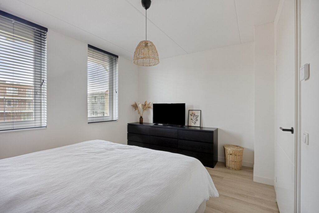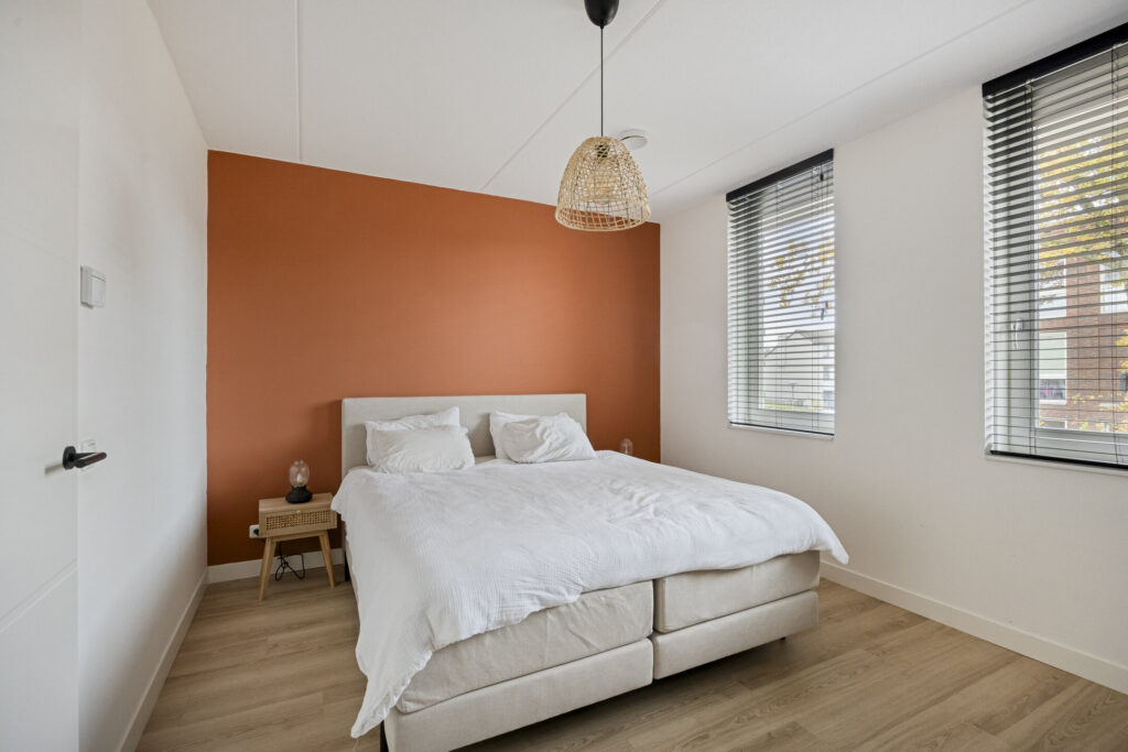Op de eerste verdieping bevinden zich drie slaapkamers, alle voorzien van een doorlopende laminaatvloer met vloerverwarming en -koeling, houten kozijnen en ramen met HR++ beglazing en gladde wanden in neutrale tinten. De ruime ouderslaapkamer is gelegen aan de achterzijde en biedt meer dan voldoende plek voor een groot bed en kledingkast.