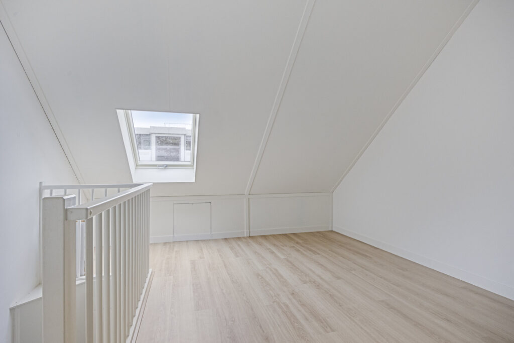 De tweede verdieping is een (onverwarmde) royale open zolderruimte met laminaatvloer en een groot dakraam aan de voorzijde. Een afgesloten technische ruimte biedt plek aan de (bodem)warmtepomp, WTW-unit, zonnepanelen omvormer én de aansluitingen voor wasapparatuur. Een extra slaapkamer, kantoor of hobbyruimte op deze verdieping is eenvoudig te realiseren.
