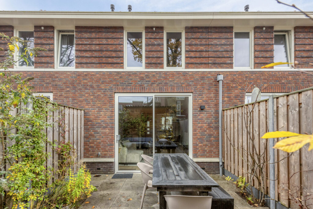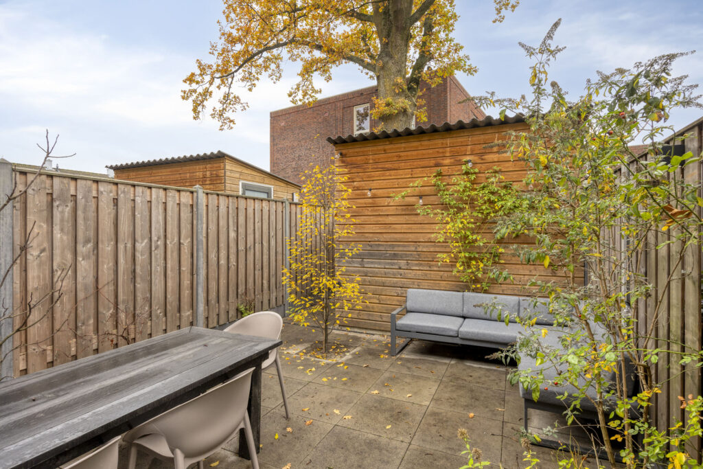 De gezellige achtertuin is grotendeels bestraat en wordt afgewisseld met enkele boompjes en beplanting die zorgen voor een groene en sfeervolle uitstraling. Achter in de tuin staat een houten berging en er is een achterom aanwezig. Een fijne plek om heerlijk buiten te zitten.