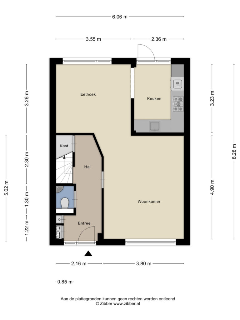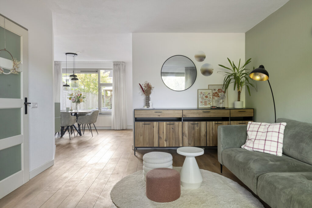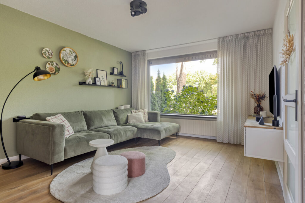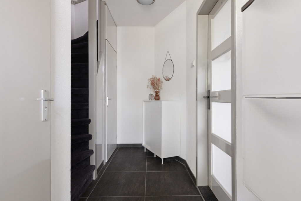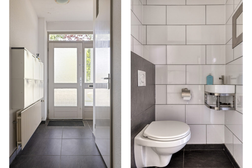 Je komt binnen in de hal waar de vernieuwde meterkast, trapopgang, bergkast en een moderne toiletruimte met wandcloset en fonteintje zich bevinden. Via een deur, ingezet met glas, kom je in de Z-vormige woonkamer welke is voorzien van een houten vloer en grote raampartij aan zowel voor- als achterzijde.