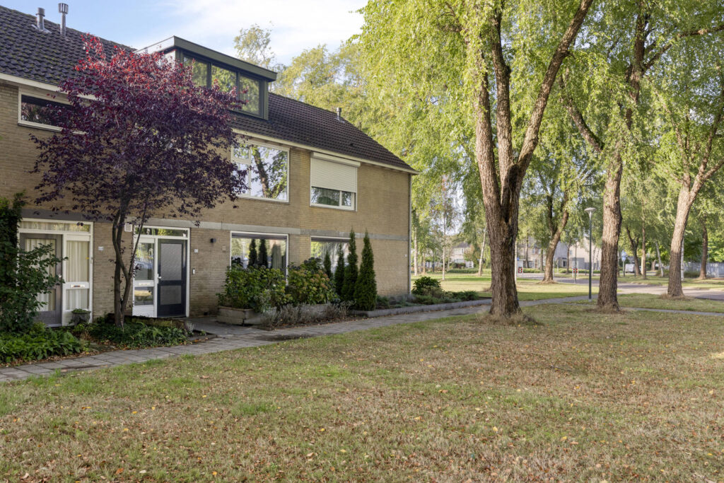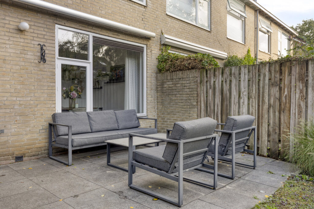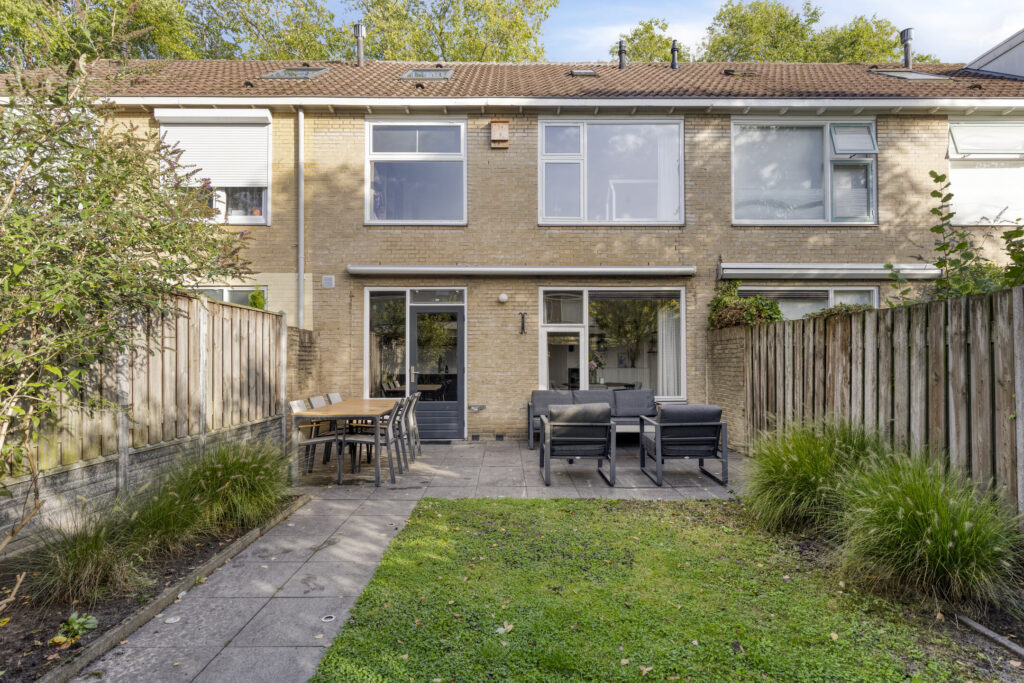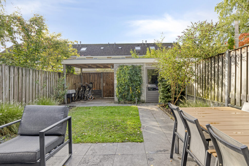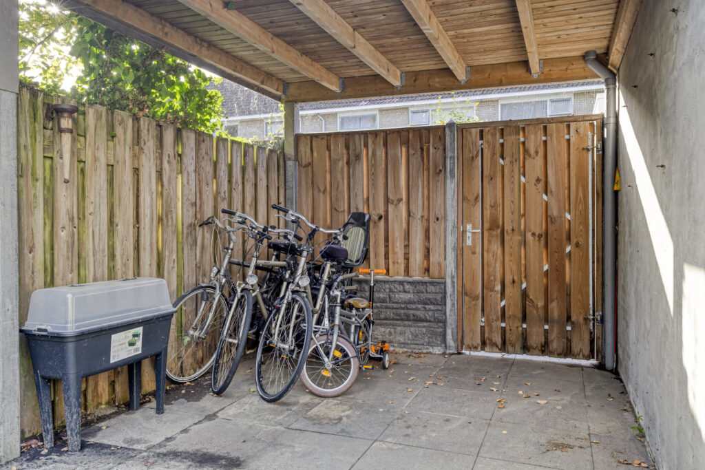 De achtertuin is heerlijk zonnig en gelegen op het zuiden. Direct achter de woning is een terras met elektrische zonneluifel. Verder is er een gazon, borders met beplanting, een praktische fietsenberging met aansluitend een overkapping met achterom via de poort. Ook zijn er een elektrapunt en buitenkraan aanwezig. De voortuin is onderhoudsvriendelijk aangelegd met bestrating en twee plantenbakken.