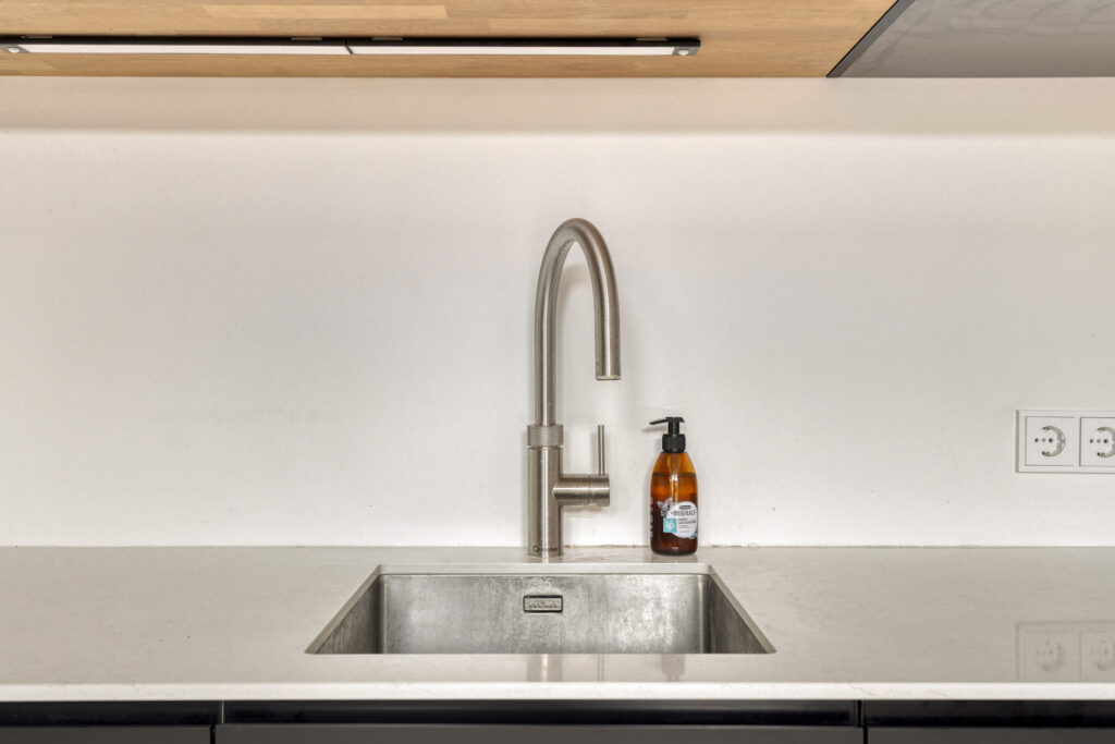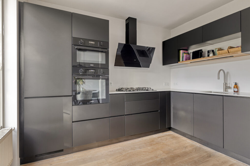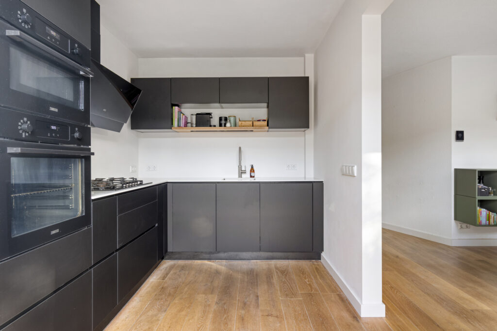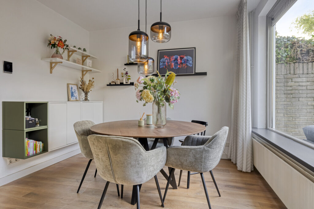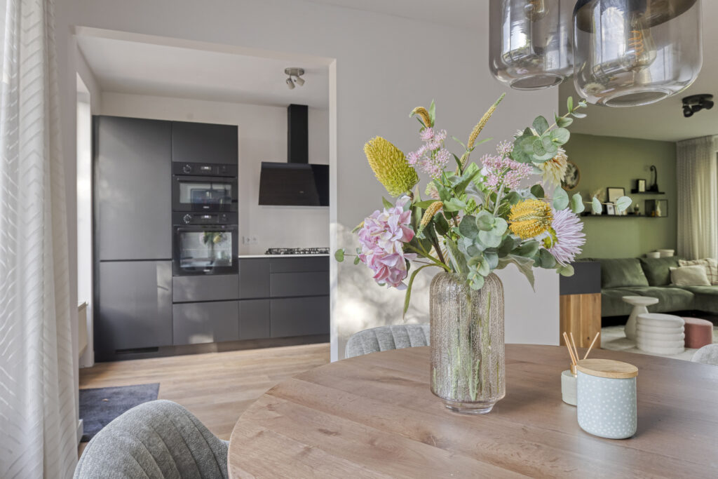 Aan de tuinzijde ligt het eetgedeelte welke in open verbinding toegang geeft tot de keuken. Deze is in 2021 ingericht met een moderne hoekopstelling en is van alle gemakken voorzien waaronder een koel-/vriescombinatie, combimagnetron, separate oven, 5-pits gaskookplaat met afzuigkap, vaatwasser, composiet werkblad én een Quooker voor direct heet water. Vanuit de keuken heb je toegang tot de achtertuin.