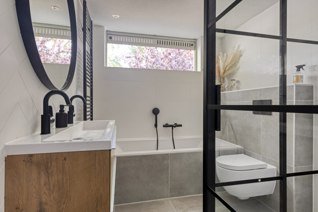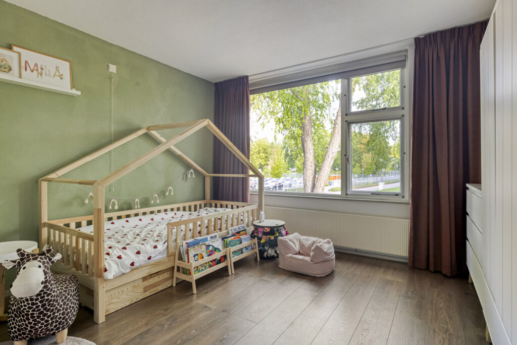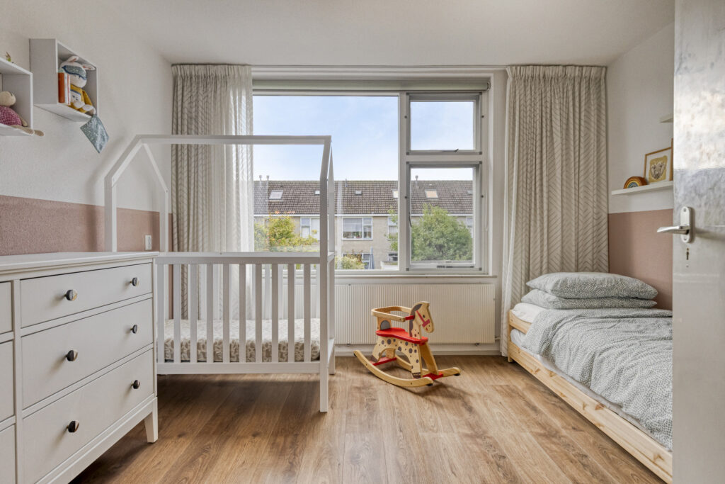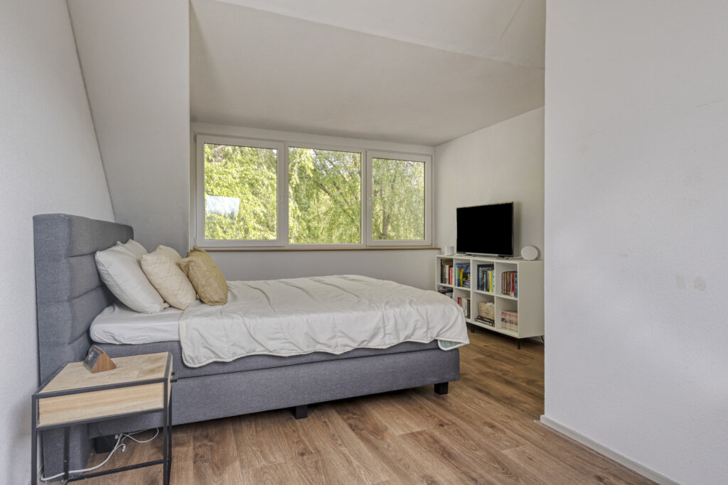Op de eerste verdieping vind je drie slaapkamers en de badkamer. De overloop en slaapkamers zijn voorzien van een doorlopende laminaatvloer en de kamers hebben allen houten kozijnen en ramen met dubbele beglazing. Twee kamers zijn gelegen aan de tuinzijde waarvan er één beschikt over een wastafelaansluiting en de tweede over een vaste kast. De ruime slaapkamer aan de voorzijde biedt een leuk uitzicht en veel lichtinval. De moderne badkamer (2022) is compleet ingericht met een inloopdouche, ligbad, brede wastafel met dubbele kraan en een wandcloset. Een vast raam met ventilatiestrook zorgt voor daglicht en frisse lucht.