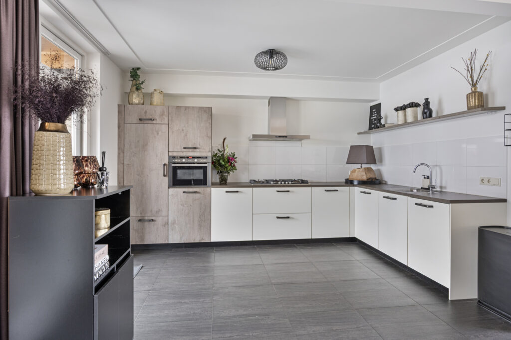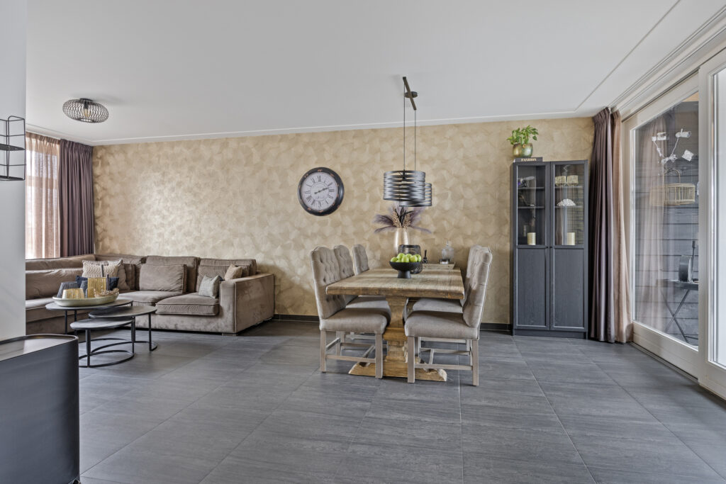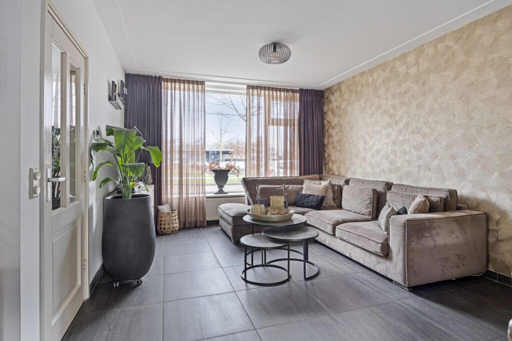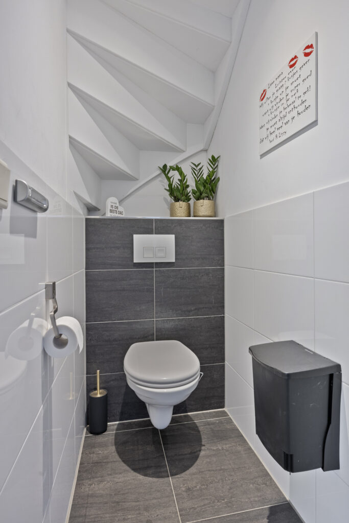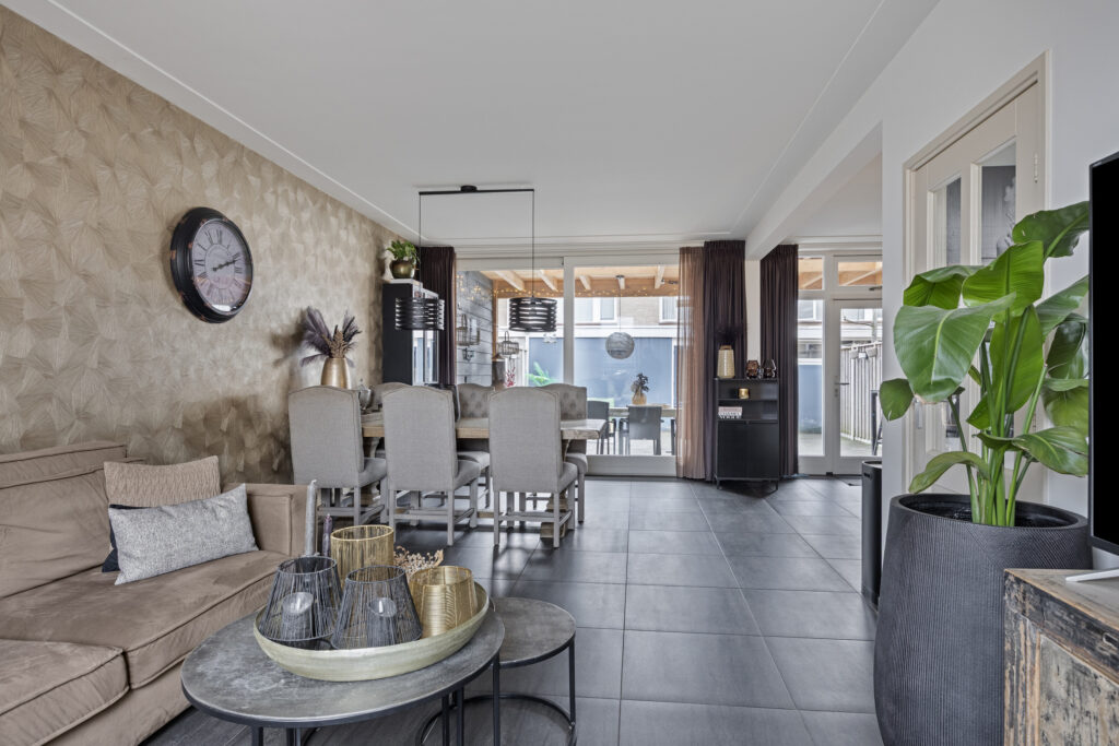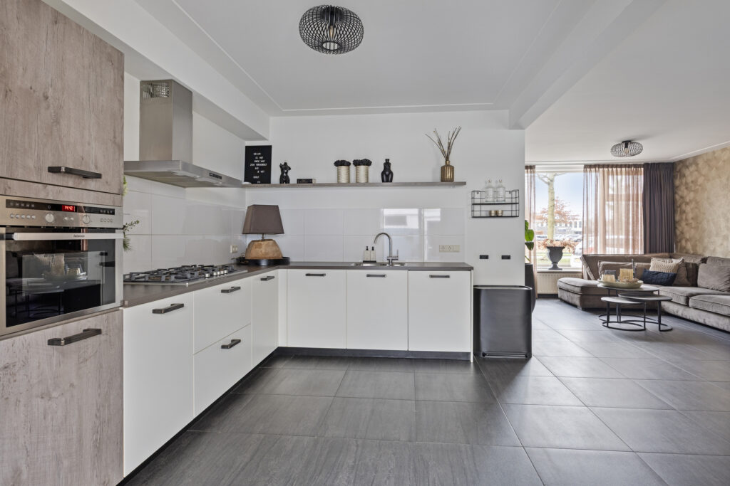 Hal/entree met meterkast, voorraadkast en een betegelde toiletruimte met hangend toilet, fonteintje en inbouwspots. Toergang tot de woonkamer middels een met glas in gezette deur. De ruime woonkamer is aan de achterzijde voorzien van een grote schuifpui naar het overdekte terras. De open keuken heeft een ruim keukenblok in hoekopstelling dat is voorzien van een vijfpits gaskookplaat, afzuigkap, combimagnetron, vaatwasser, koelkast en close-in-boiler. De keuken is voorzien van volop opbergruimte. Een deur geeft toegang tot de achtertuin. De gehele begane grond is voorzien van een identieke tegelvloer, welke in woonkamer en keuken is voorzien van vloerverwarming. De wanden en plafonds zijn glad gestukadoord.