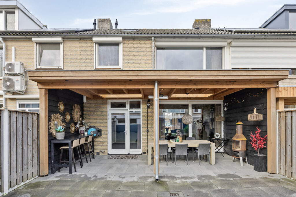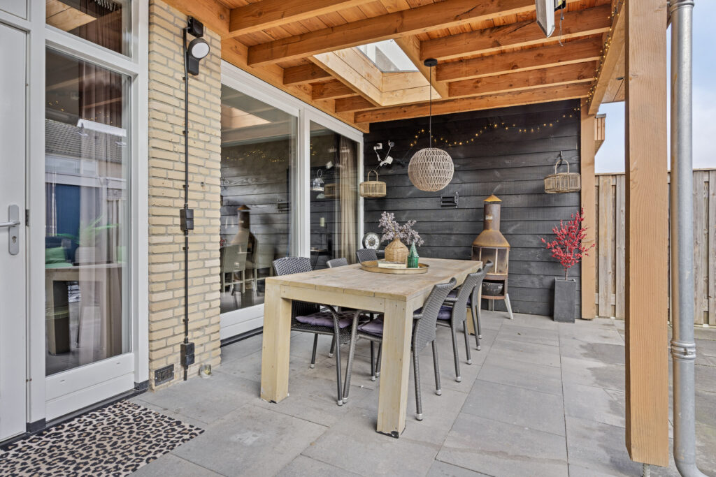Voortuin. Op het zuiden gelegen achtertuin voorzien van bestrating. Direct aan de woning een mooie houten terrasoverkapping met twee lichtkoepels voor extra daglicht. Grote berging over de volledige breedte van dd tuin. In de berging is de poort naar de achterom.