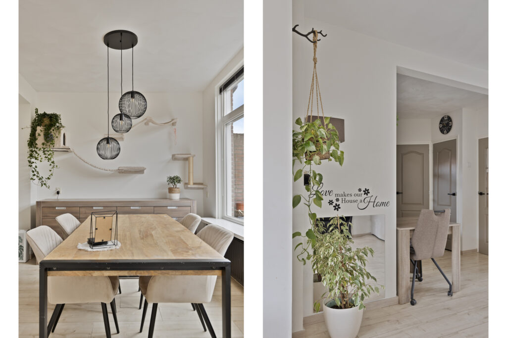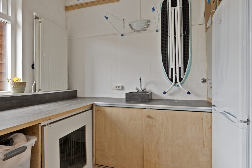 Aan de tuinzijde vind je aansluitend een praktische bijkeuken met klein keukenblok, aansluitingen voor wasapparatuur, radiator, mechanische ventilatie en extra kastruimte.