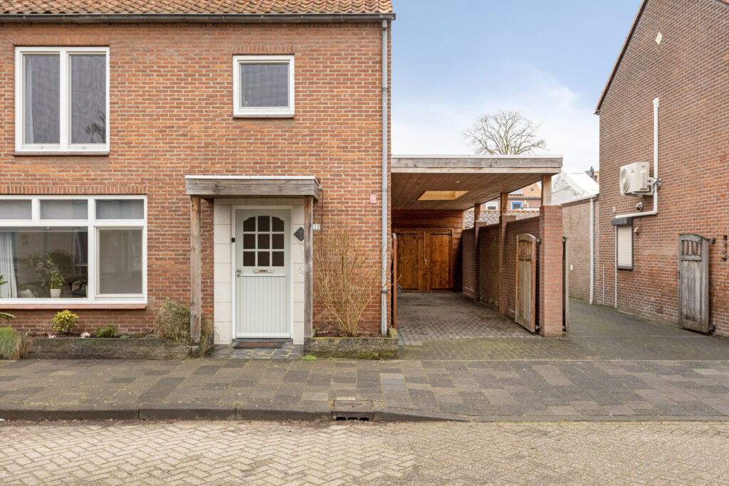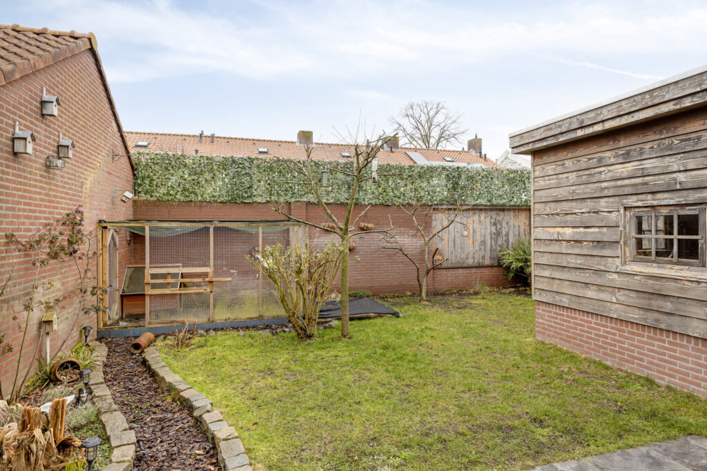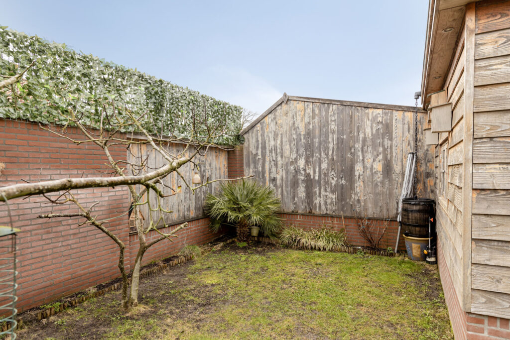 De achtertuin is verzorgd aangelegd met gazon, terras en een kleine border. Aan de zijkant van de woning bevindt zich een diepe oprit met inbouwverlichting en lichtkoepel, afsluitbaar middels een dubbele poort. De vrijstaande garage is royaal van opzet en beschikt over openslaande deuren naar de oprit, inbouwspots, een vliering en raampjes met zicht op de tuin. Daarnaast is er een vaste werkbank met kastruimte aanwezig – ideaal voor hobby of opslag.