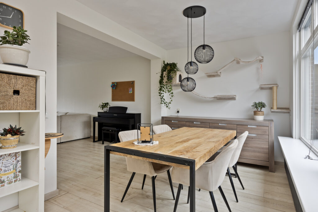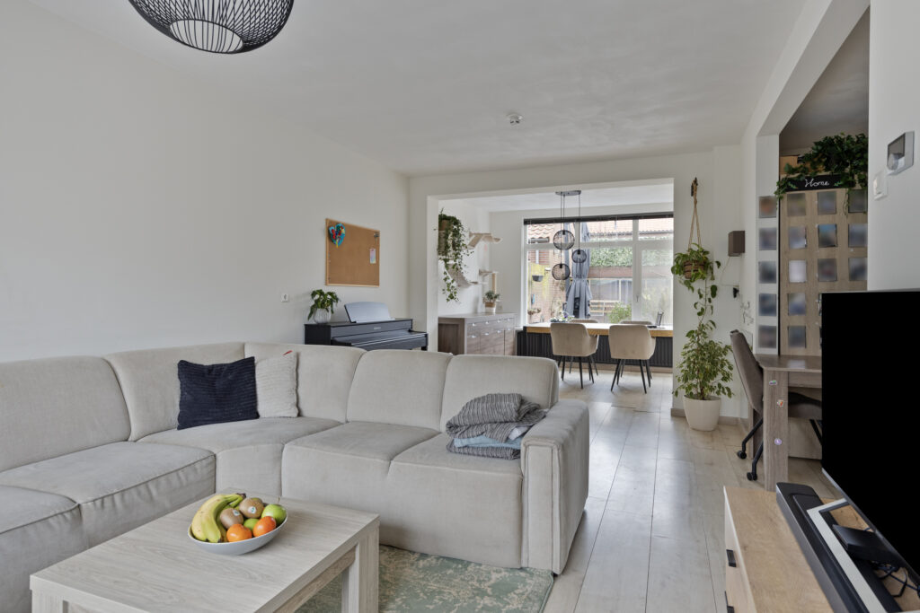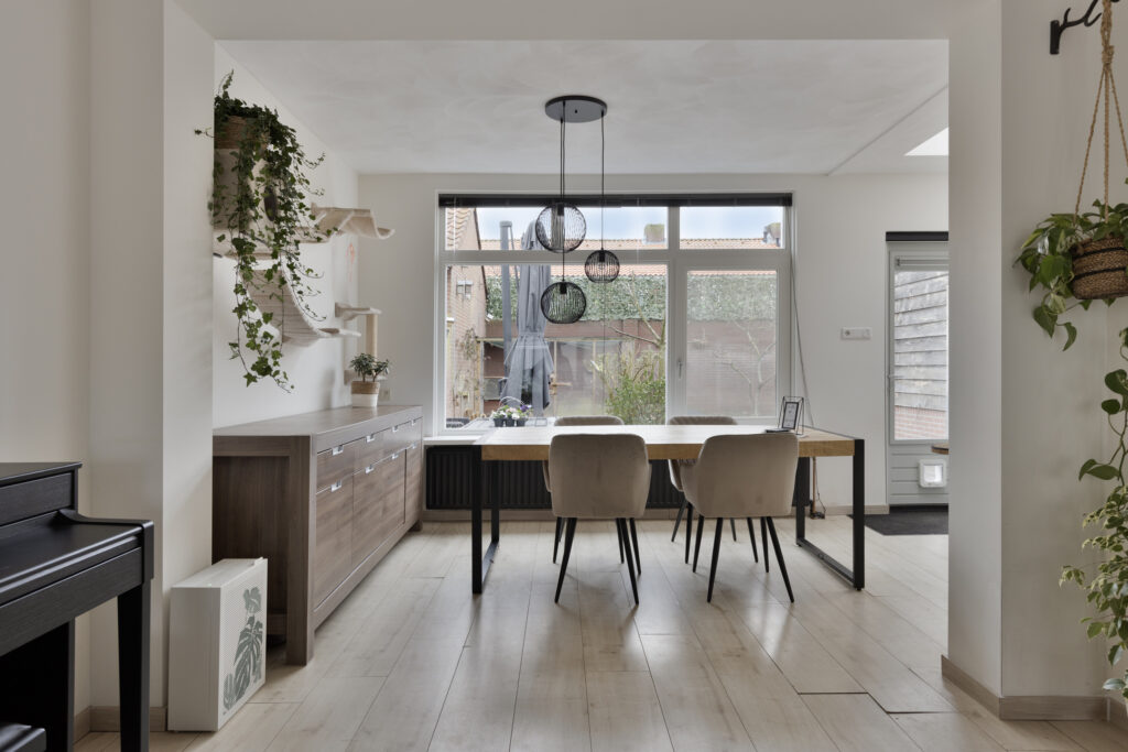 In open verbinding met de keuken ligt de woonkamer. Dankzij de uitbouw aan de achterzijde voorzien van lichtkoepel als ook de grote raampartijen aan voor- en achterzijde geniet je hier van volop leefruimte en veel natuurlijk daglicht. De ruimte is verzorgd afgewerkt met een laminaatvloer, gestuukte wanden en schuurwerk plafonds. De houten kozijnen en ramen zijn voorzien van HR++ beglazing.