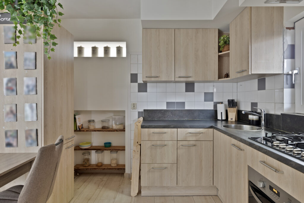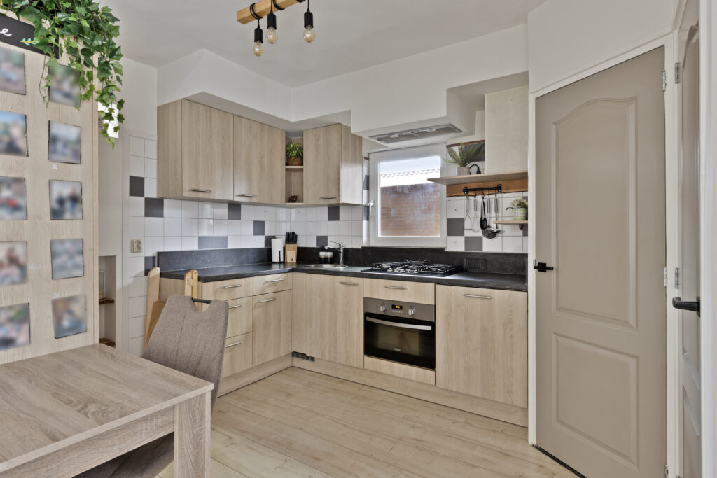 De woning wordt betreden via de keuken, opgesteld in een praktische hoekopstelling en voorzien van alle benodigde inbouwapparatuur zoals een gaskookplaat, afzuigkap, oven, vaatwasser en koel-/vriescombinatie. Onder de trap bevindt zich een handige, verdiepte voorraadkast.
