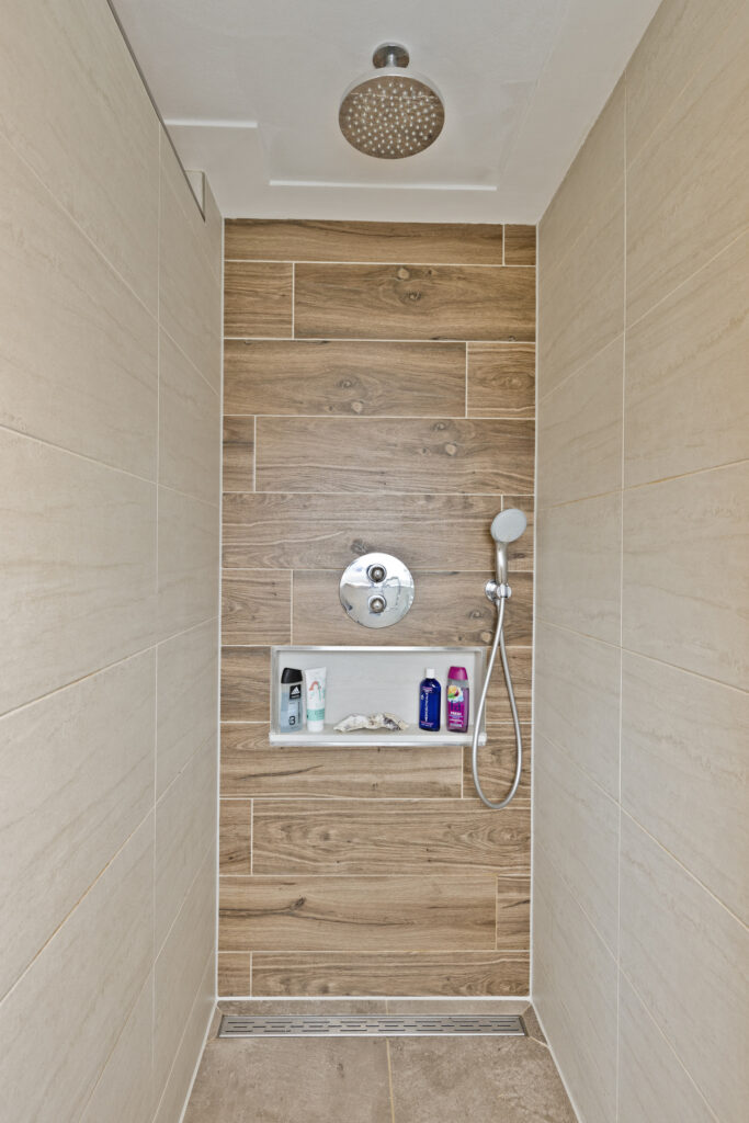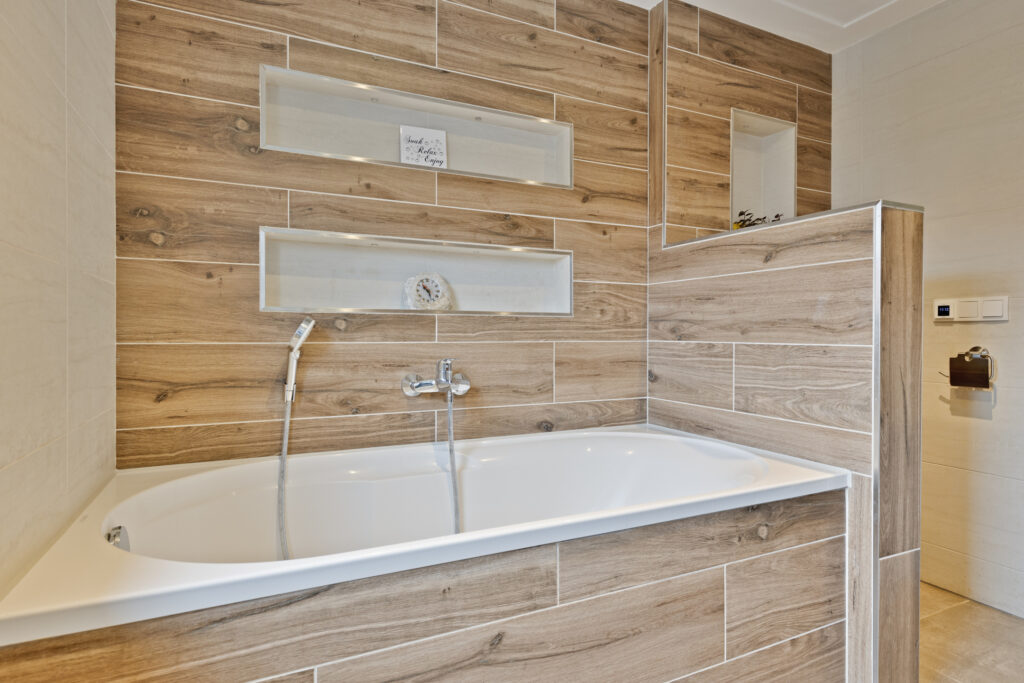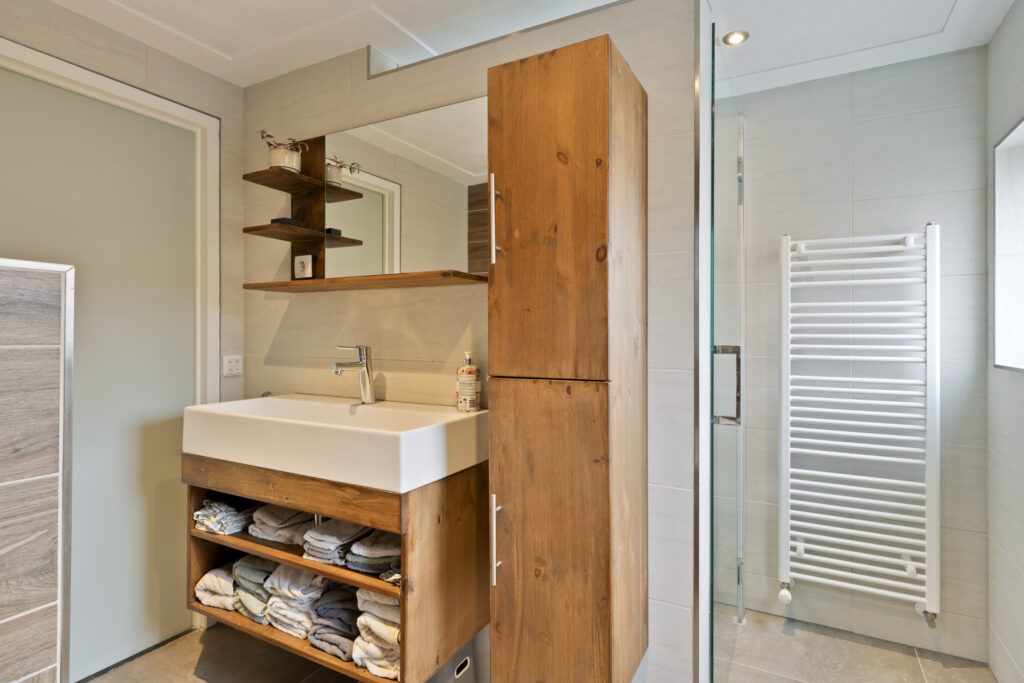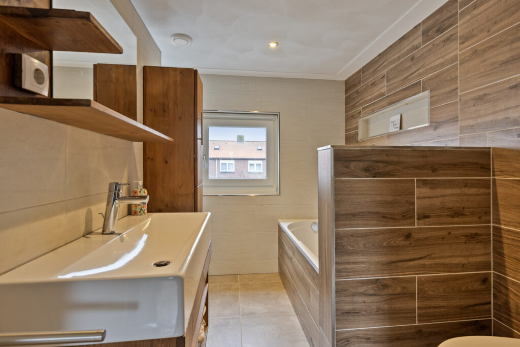 De volledig betegelde badkamer is compleet uitgevoerd met een ligbad, ruime inloopdouche, wandcloset en een brede wastafel met meubel. Daarnaast is er een handdoekradiator, elektrische vloerverwarming en inbouwverlichting aanwezig.
