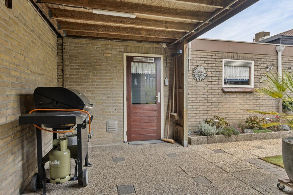 Via een dubbele poort ter hoogte van de carport is er een achterom naar de achtertuin. De diepe en zonnige achtertuin is o.a. voorzien van een ruim terras met handmatig bedienbaar zonneluifel, een gazon en borders met beplanting. Achter op het perceel bevindt zich een overdekt terras, ideaal voor de lange zomeravonden, met aansluitend een fietsenberging.