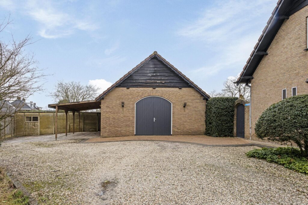 Grote oprit met plaats voor meerdere auto’s. Eveneens prima stallingsgelegenheid voor bijvoorbeeld een caravan of camper. Grote voortuin met gazon. De zijtuin heeft een groot terras. Riante achtertuin met een groot gazon en diverse volgroeide bomen. De gehele tuin is mooi omheind en biedt volop privacy. Grote vrijstaande garage (ca. 67 m²) met elektra, water en een vliering over het grootste deel van de garage. Naast de garage bevindt zich nog een overkapping/carport.